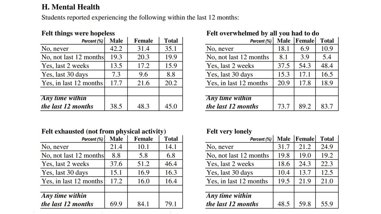私がそう思うようになったきっかけは2010 年あたりから徐々に問題化したうつ病や不安障害を抱える大学生、自分の面倒をみれない学生の増加にあります。実際2013 年にAmerican College Health Association が全米153の大学、10万人の学生を対象に行った心身の健康に関する調査では、 83.7%がやることがありすぎてどうしていいかわからないと答え、79.1%が心が疲れている、59.6%がとても悲しい、55.9%がとても孤独、51%が不安障害を訴え、31%が鬱、8%が自殺を考えたことがあると言っています。