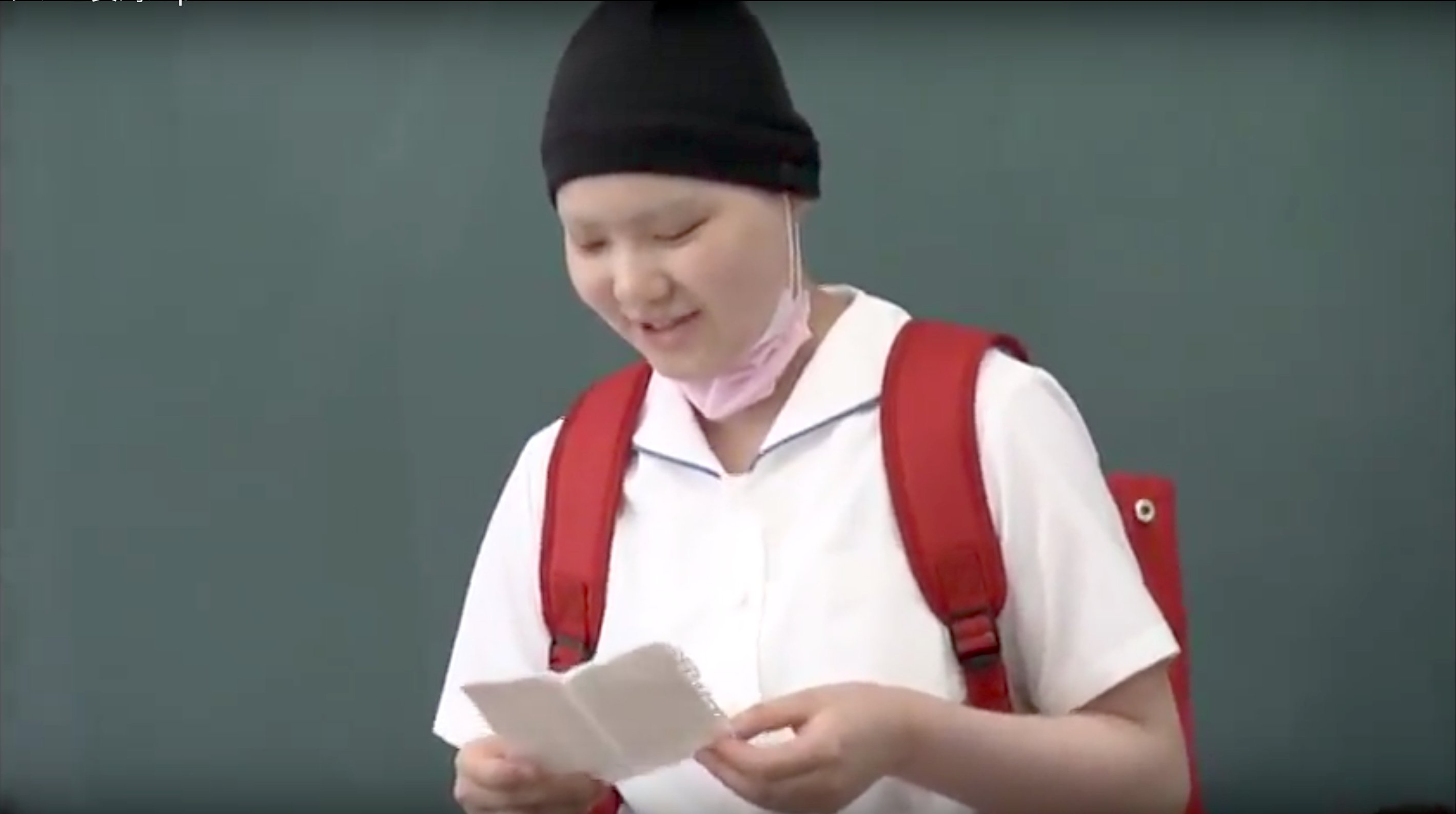辛い抗がん剤治療、左足の切断、そしてまた、つらい抗がん剤。あまり思い出したくありませんが、とてもつらく、きつい入院生活。高校受験をし、中学校を歩いて卒業できたこと。そして入学。それから3か月、ここにこうして登校できたこと。手術よりも不安でいっぱいです。