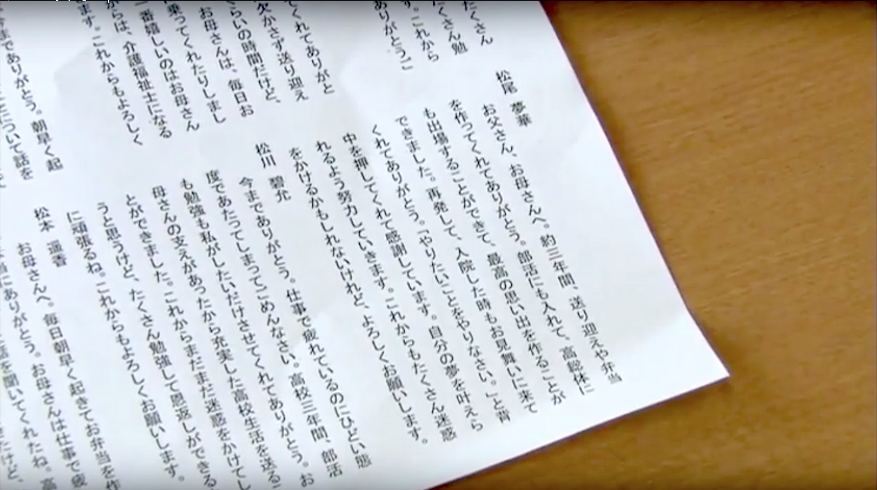 「送り迎えや弁当を作ってくれてありがとう。やりたいことをやりなさいと背中を押してくれて感謝しています。自分の夢を叶えられるよう努力していきます。これからもたくさん迷惑をかけるかもしれないけど、よろしくお願いします」