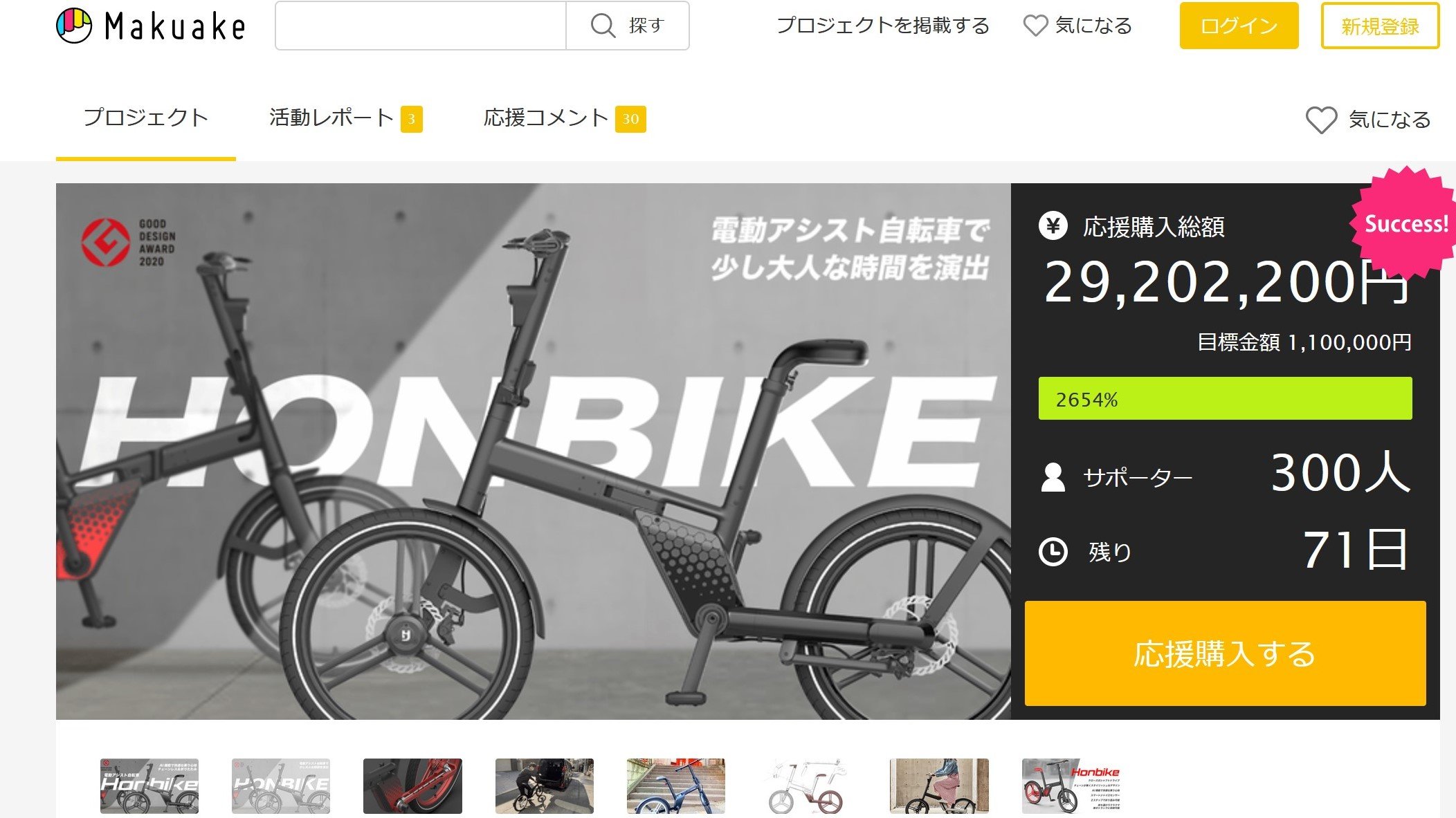 ホンバイクは2021年2月から、Click HoldingsのECサイト「CH-market」で予約販売をしていたが、4月12日にクラウドファンディングサイト「Makuake」で限定カラーの発売プロジェクトを始めたことがきっかけで、一気に注目を集めた。
