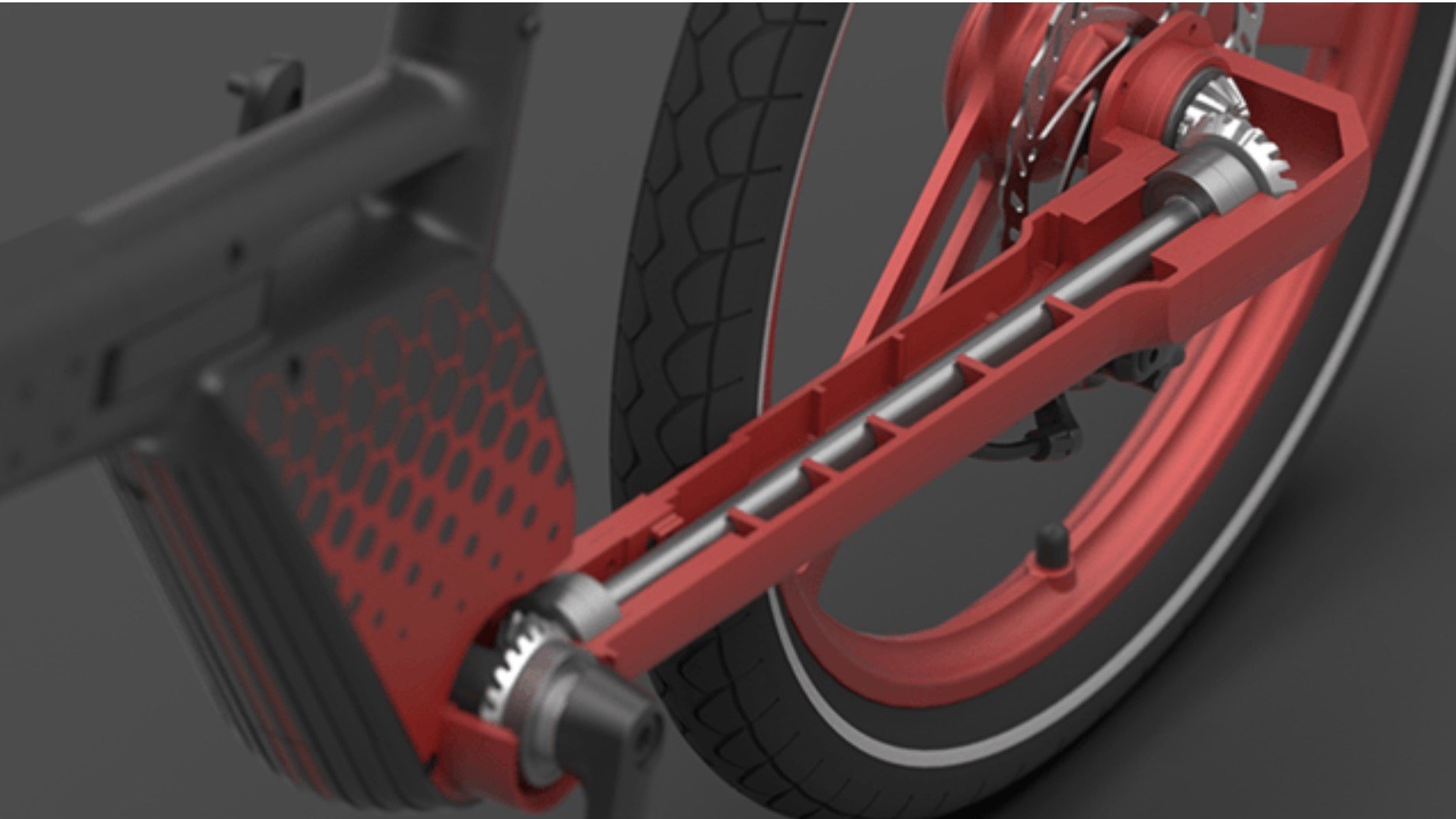 シングルアームシャフトドライブシステムという、シャフト駆動を採用しています。具体的にはバッテリーを搭載している「ペダル部分」と後輪の「タイヤ部分」を、両端に歯車状の溝が刻まれた棒状の金属パーツでつないでいます。