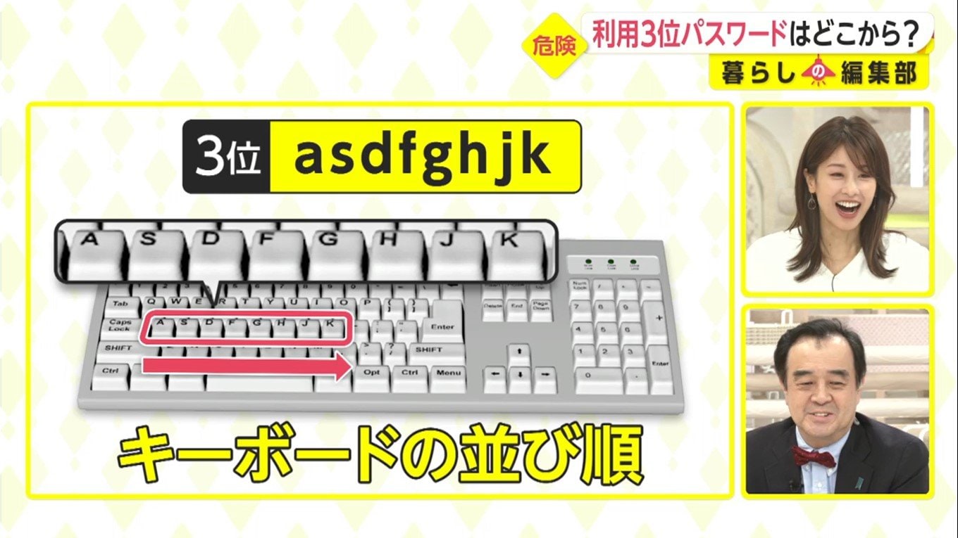 そして漏洩しやすいパスワードの3位は「asdfghjk」。