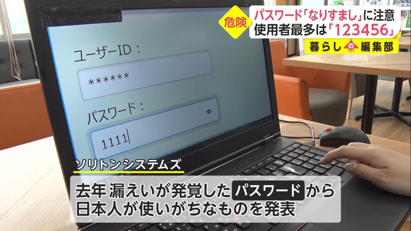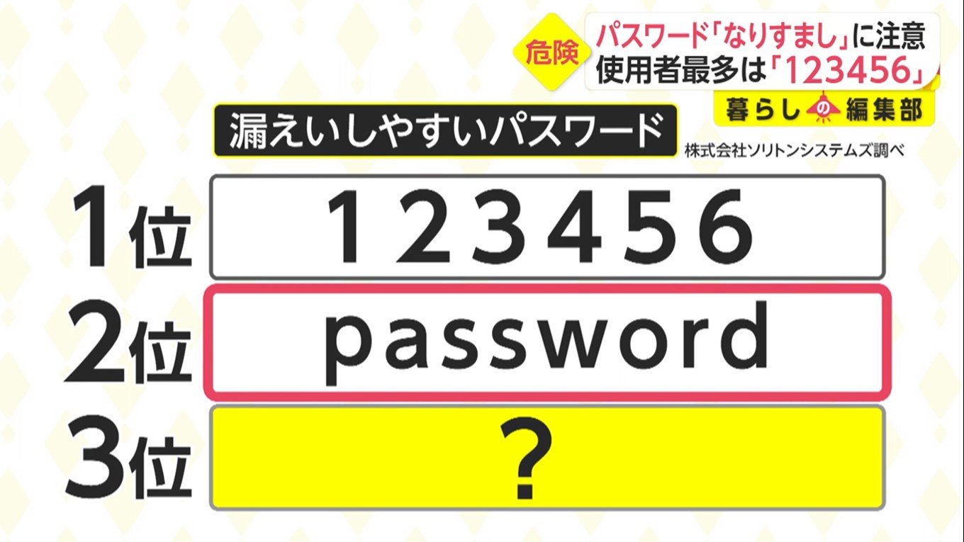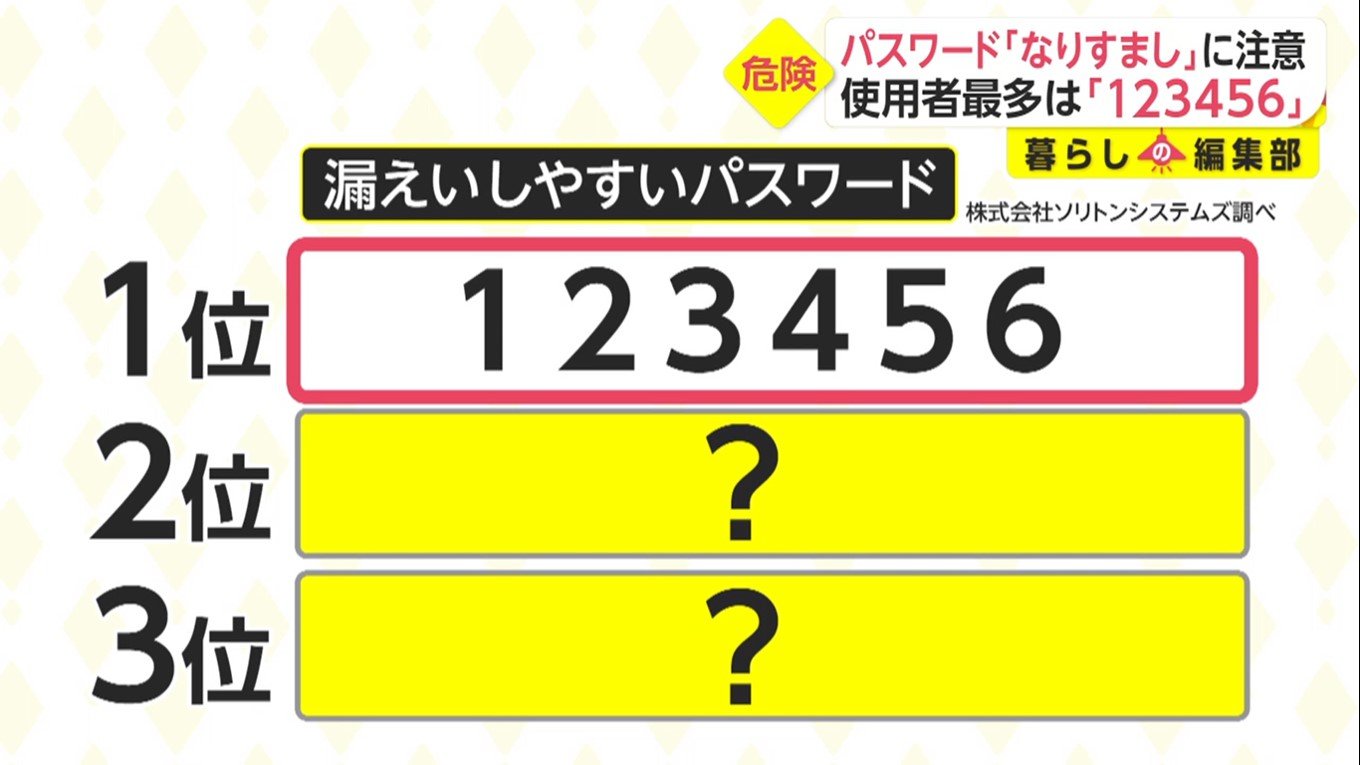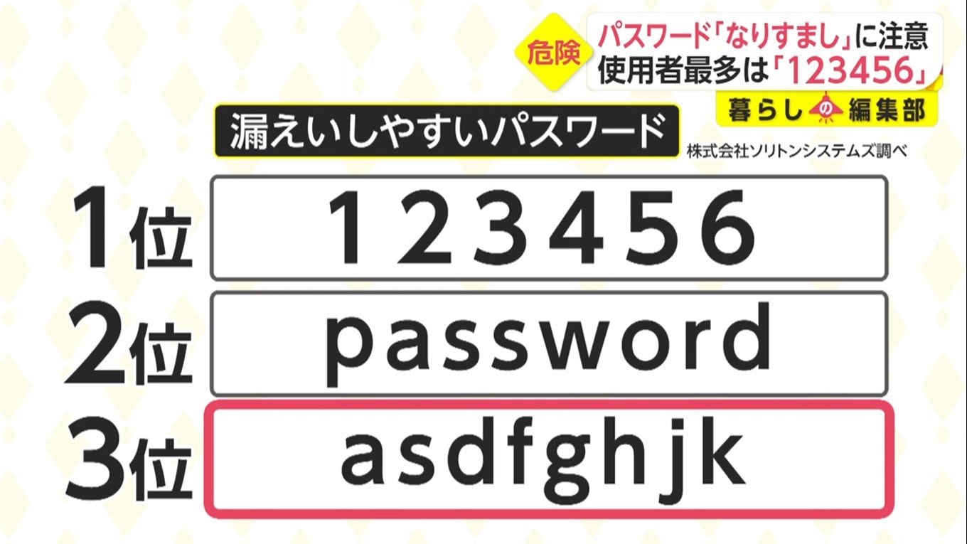 サイバー対策製品などを手がける「ソリトンシステムズ」は注意喚起のため、2020年漏えいが発覚したパスワードの中から日本人が使いがちなものをランキングで発表。