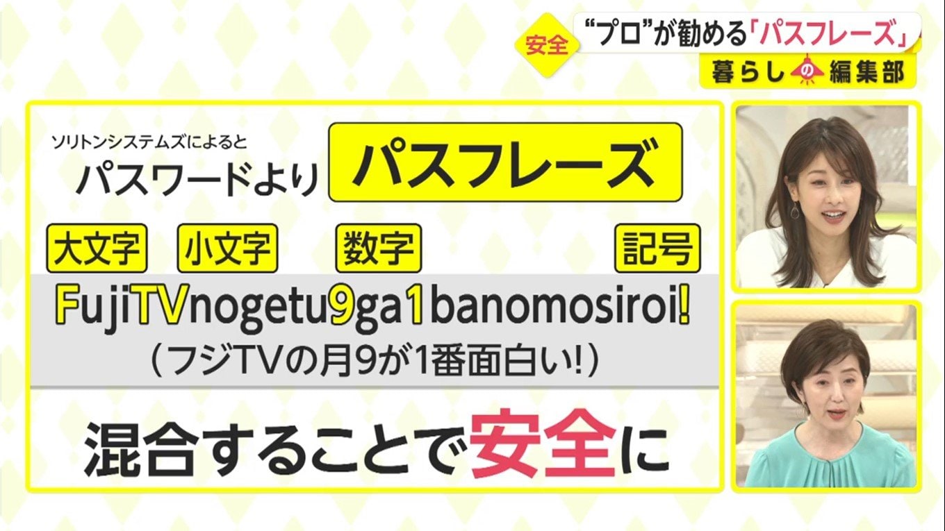 これでは危険ですので安全なパスワードの設定の仕方を教わりました。サイバー対策製品などを手がける会社によりますとパスワードではなく、今安全なのはパスフレーズだということです。言葉ではなく文章。