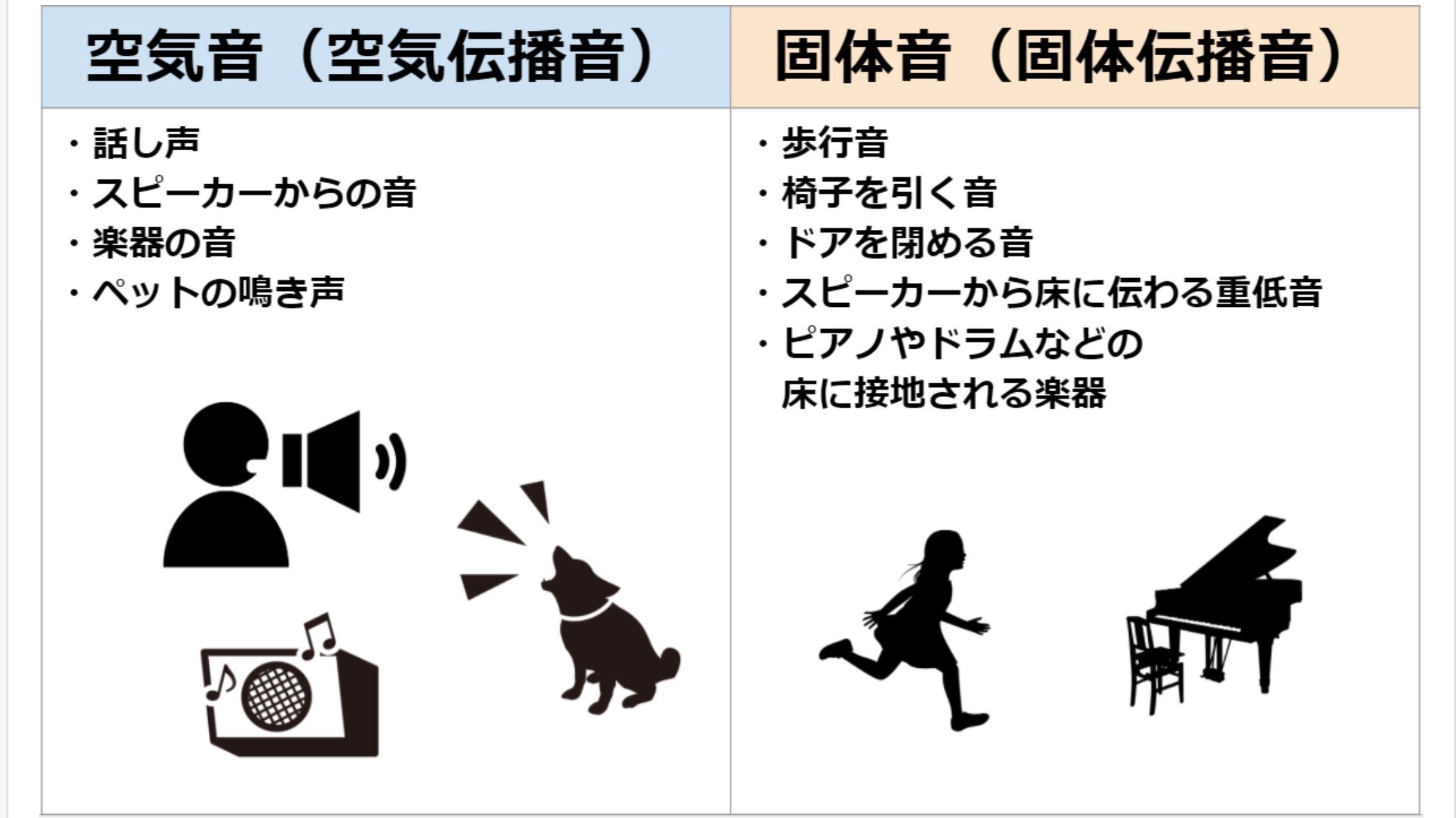 また、楽器の音やテレビ・ステレオの音は空気音ですが、ピアノやドラムなどの床に設置する楽器、スピーカーから床に伝わる音などは、固体音としても伝わります。ただ、空気音は壁や床で遮られ、隣の住戸まで届きにくいため、固体音として伝わる音のほうが問題になります。