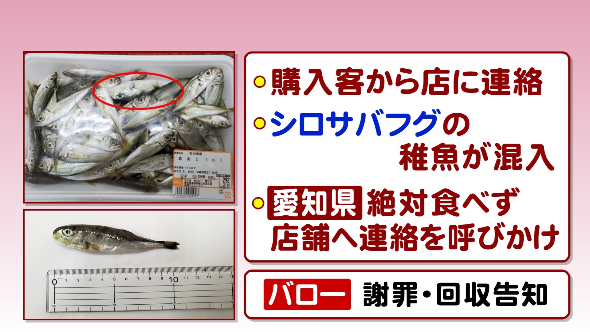 8月、愛知県蟹江町のスーパー「バロー蟹江店」で販売された真アジのパックに、フグの稚魚1匹が混入していることがわかった。