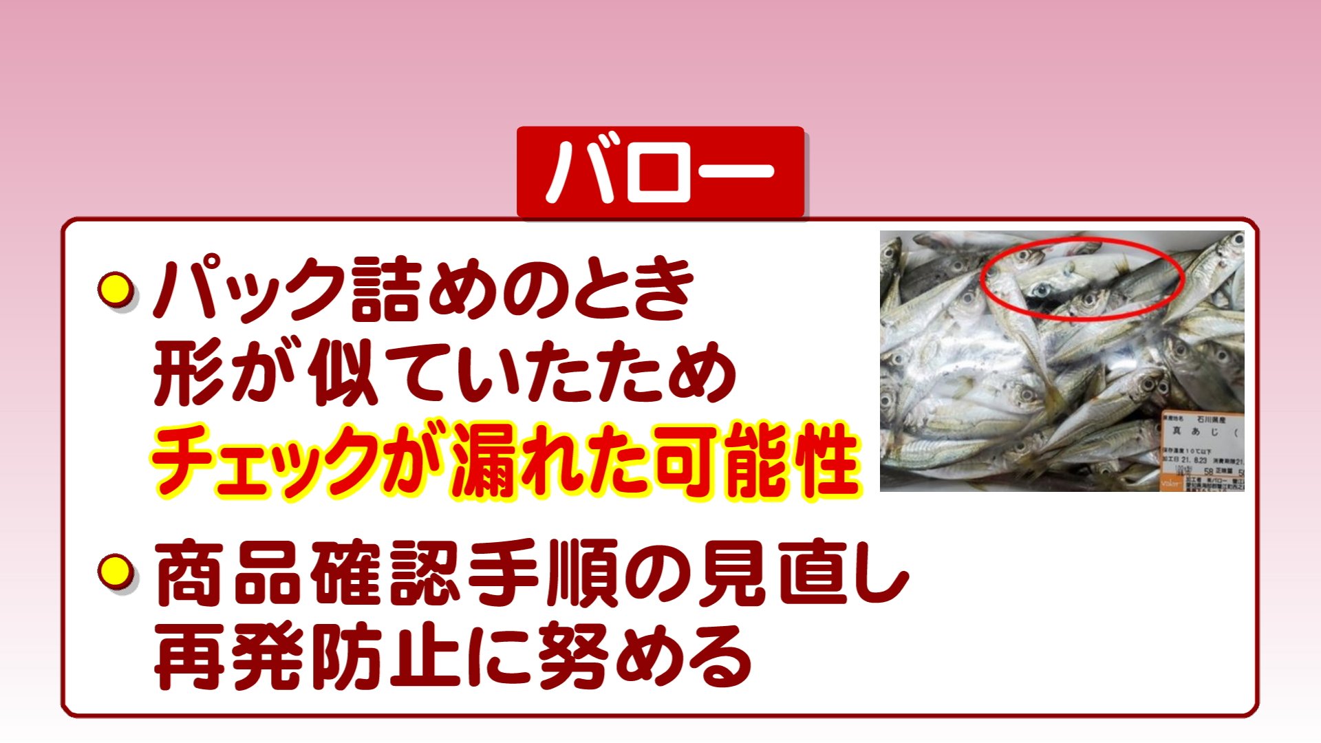 フグの混入はなぜ起こってしまったのか。バロー側に取材したところ、「パック詰めを行う最中に、形が似ていたためチェックが漏れてしまった可能性がある。今後は商品の確認手順の見直しを含めて、再発防止に努める」としている。