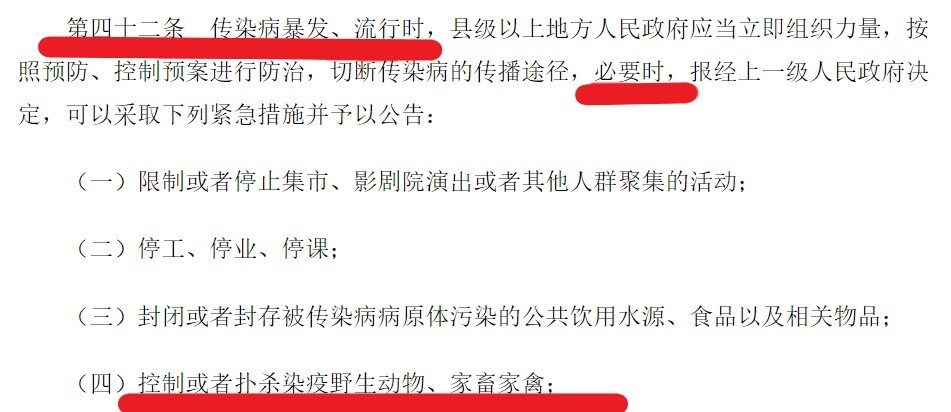 中国の感染症の予防と管理に関する法律には、「感染症が爆発した際、必要な場合は感染した動物を殺処分する緊急措置を取ることができる」と記載されている。