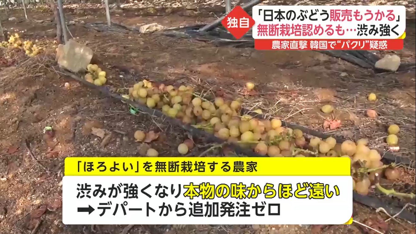 農家に直撃取材をするとあっさりとほろよいを無断で栽培したことを認め、「以前シャインマスカットがヒットしたので次の日本の品種を探していた。韓国の農家は日本のように匠の精神はない」と話している。