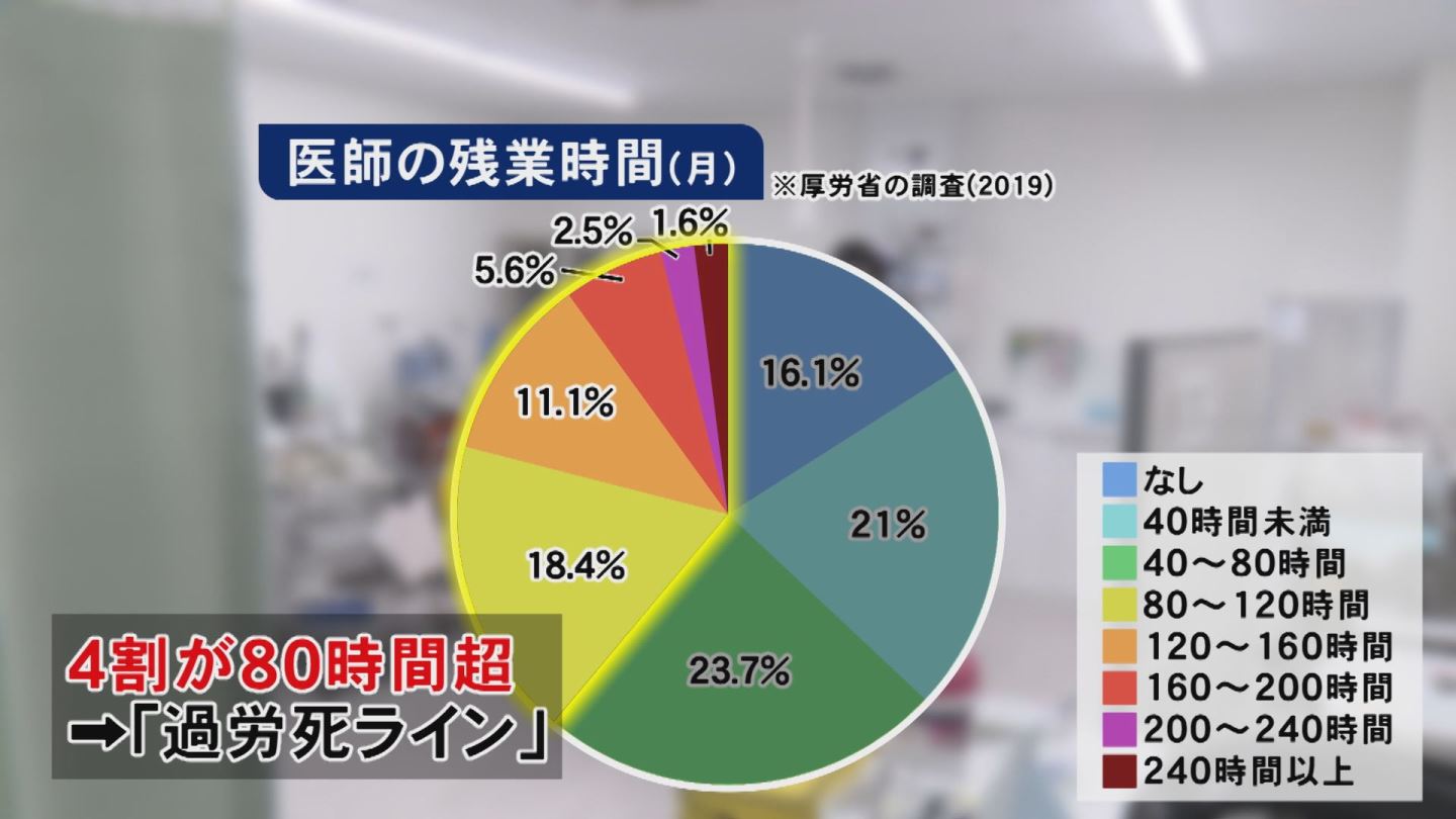日本の医師は全体の約4割が残業時間80時間以上の“過労死ライン”を超え、うち1割はその倍の160時間を超えている。2024年度からは残業時間が規制され、原則年間960時間、月に平均80時間の上限が設定される。