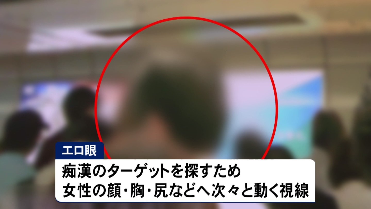 何かを探すように辺りをキョロキョロ…。捜査員たちの間で“エロ眼”と呼ばれる視線だ。女性の顔や胸、お尻などへ視線が次々と動くのが特徴で、痴漢がターゲットを探す時によく見られる。実はこの男…。