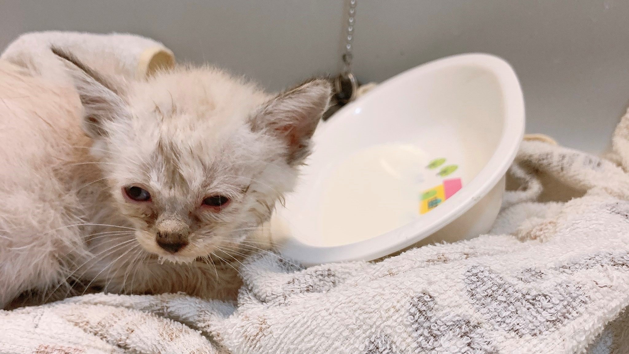 Twitterユーザーの天使こめさん(@0818kome)は、2021年8月の雨の日の夜に、側溝で鳴いていた1匹の子猫を保護した。男の子で生後1カ月ほどとみられ、大きさは手のひらサイズ。