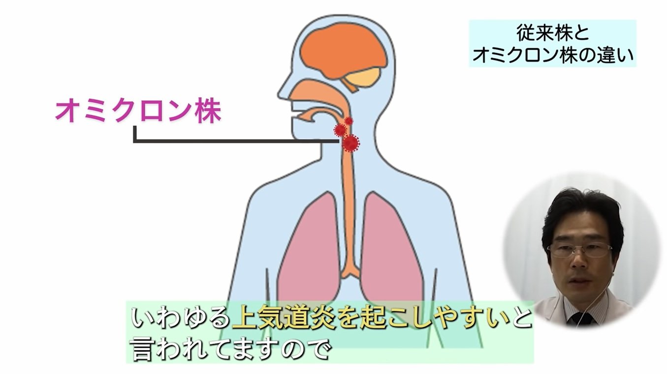 一方、オミクロン株はのどに近いところで増殖する、いわゆる上気道炎を起こしやすいと言われていて、これは普通の風邪に近い症状が出現すると考えられます。