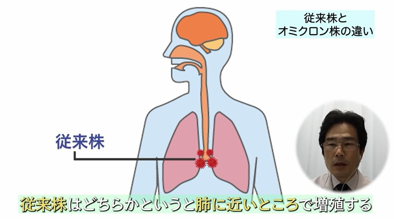 この背景は、動物実験ではありますが、ウイルスの増殖する場所が、従来株はどちらかというと肺に近いところで増殖するため肺炎を起こしやすかった。