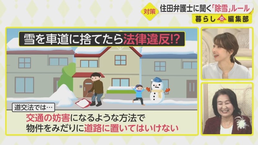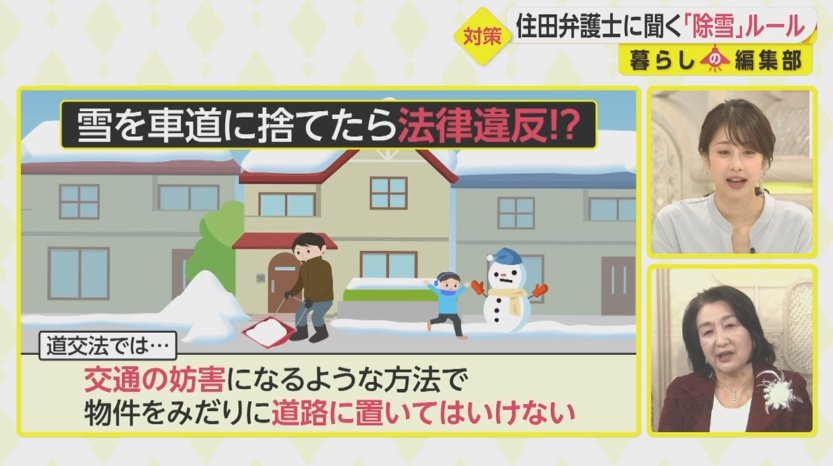 「自宅前の雪を車道に投げ捨てている人を見かける、道路に雪がたまって困る、これは法律違反です!」というネット上の声がありしたが、住田さんこれは実際に法律違反なんでしょうか?