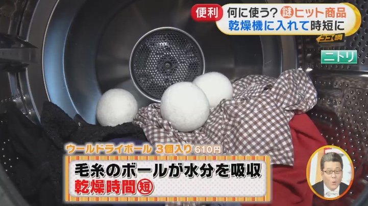 さらに、静電気や絡まりも防ぐことができるという便利アイテムである。全自動洗濯乾燥機の場合は、洗濯・脱水の後、乾燥の時にボールを入れて使用。