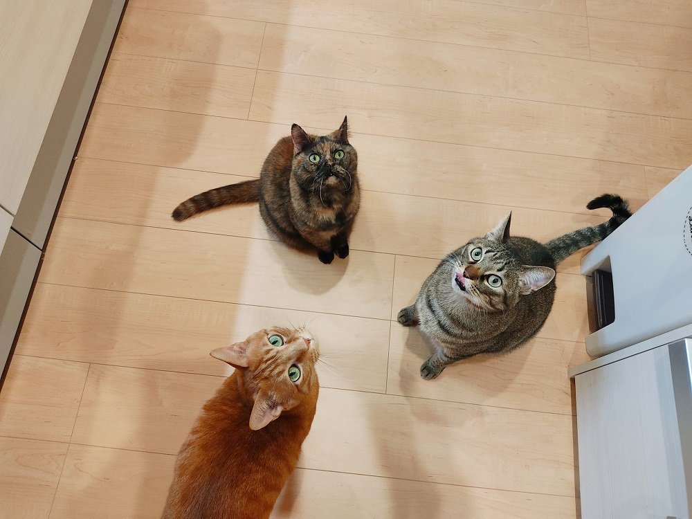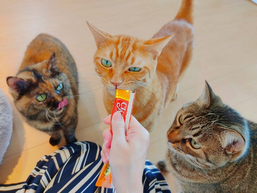 圧に耐えられなくなったので、「もうやっちゃだめだからね」と告げ、猫用おやつの「ちゅ~る」で和解しました。待っていましたとばかりに、他の2匹もちゅ~るをパクパク。