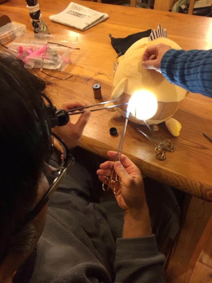 ルーペを装着し、“傷口”にライトを照射。皮膚ならぬ生地をサクサクと縫い進め、見事ぬいぐるみの穴はきれいに塞がった。