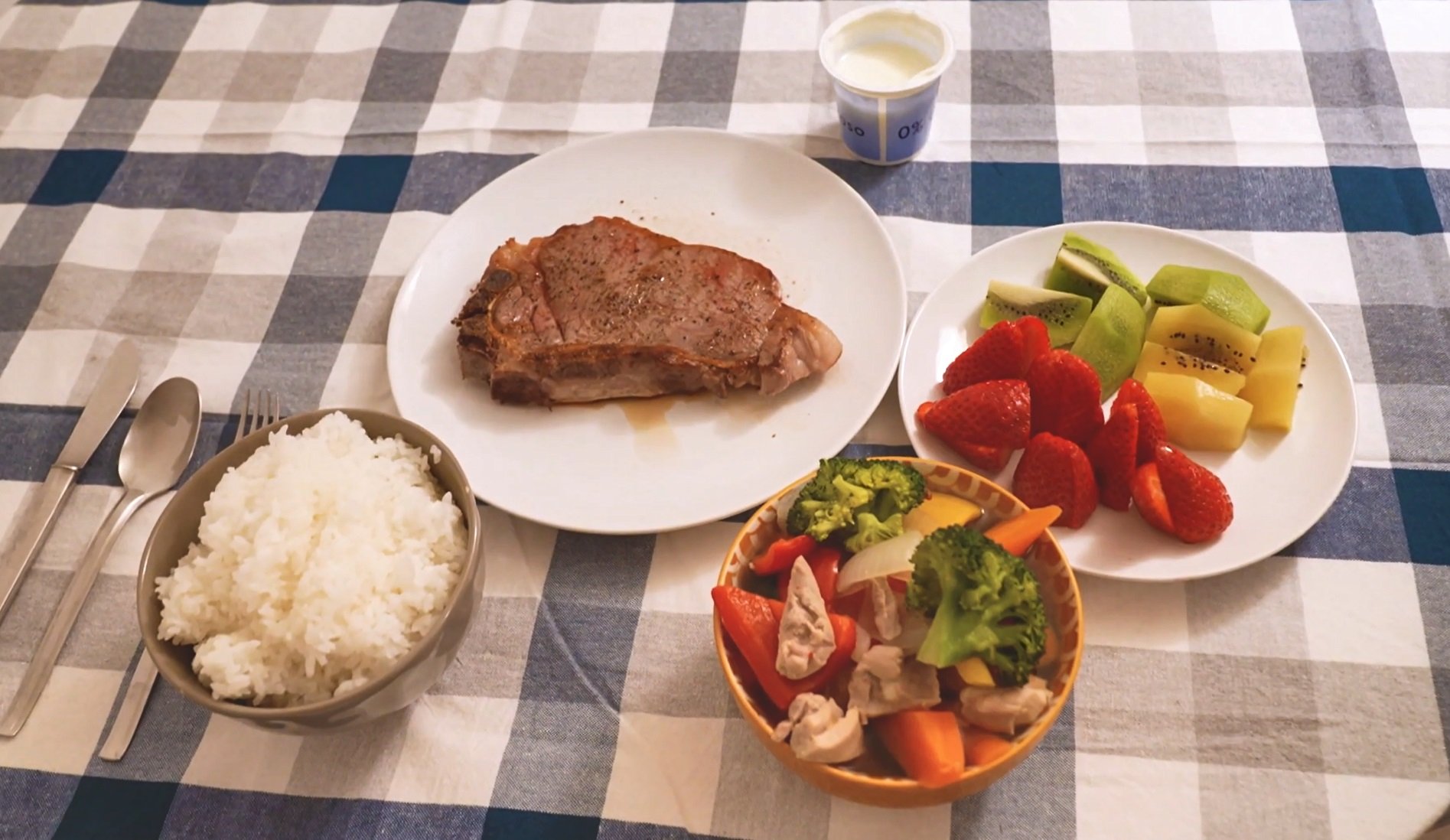 色鮮やかなたっぷりの野菜と、たんばく質が豊富な大型ステーキ。そして大盛の炭水化物。フルーツも添えられている。