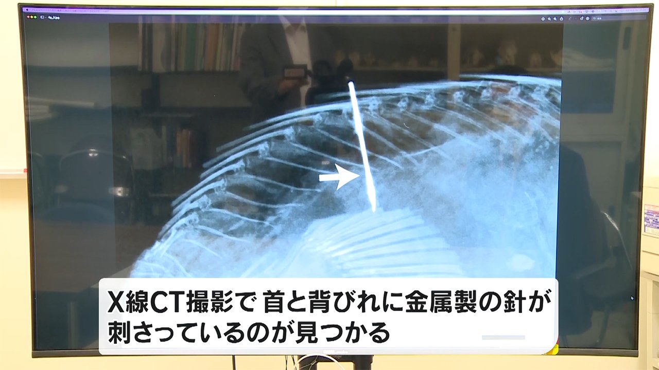X線CT撮影による調査では、首と背びれに金属製の針が刺さっていることが確認された。