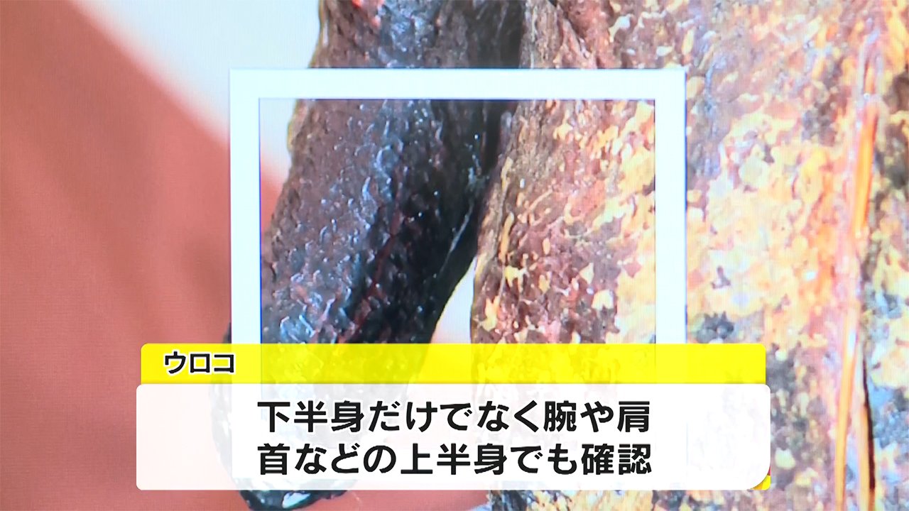 また、魚類の特徴であるウロコが、下半身だけでなく腕や肩、首など上半身にも見られた。