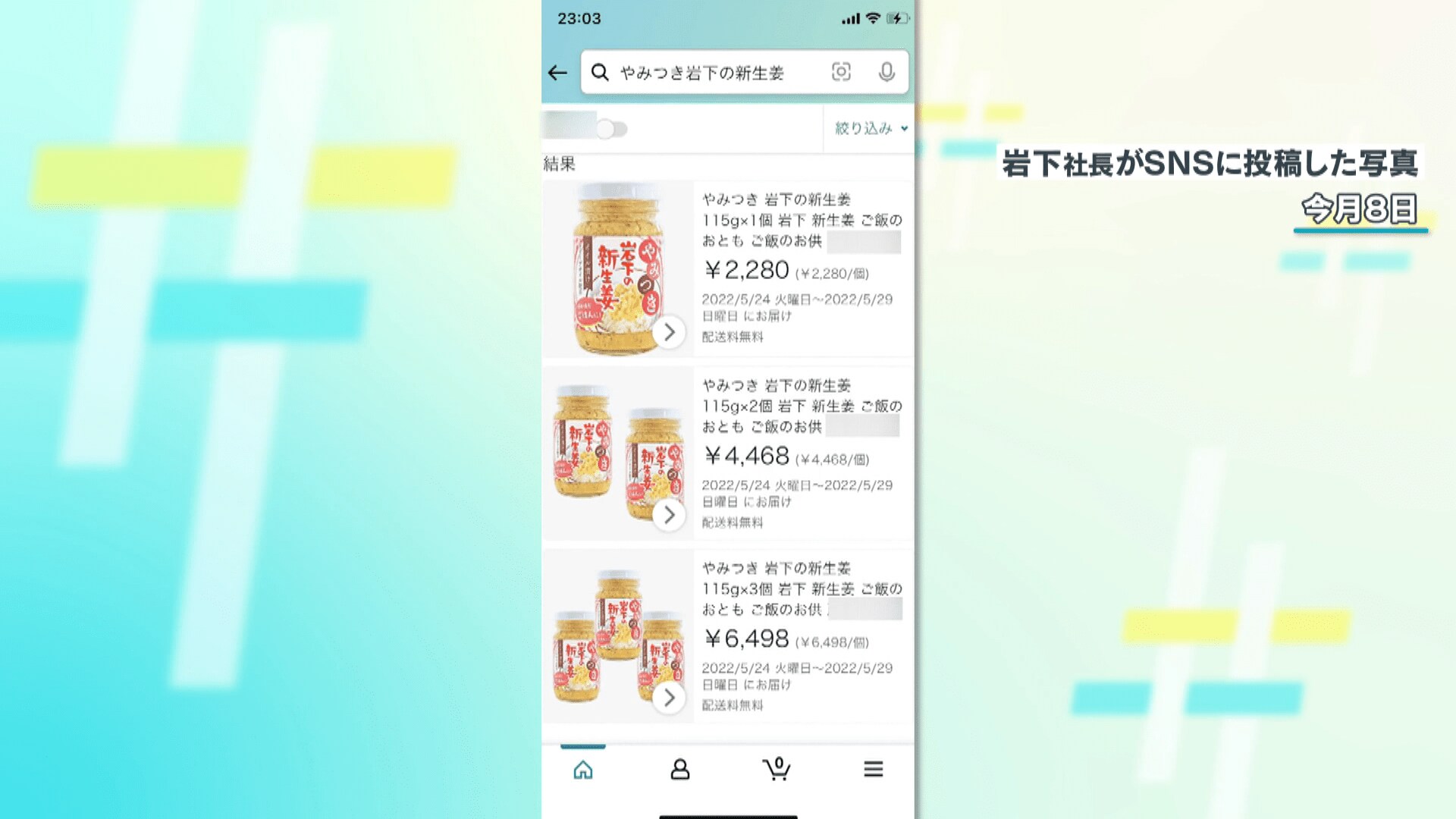 5月8日、岩下食品の岩下社長がSNSに投稿した画像。通販サイトに岩下食品の人気商品「やみつき 岩下の新生姜」が出品されている写真です。