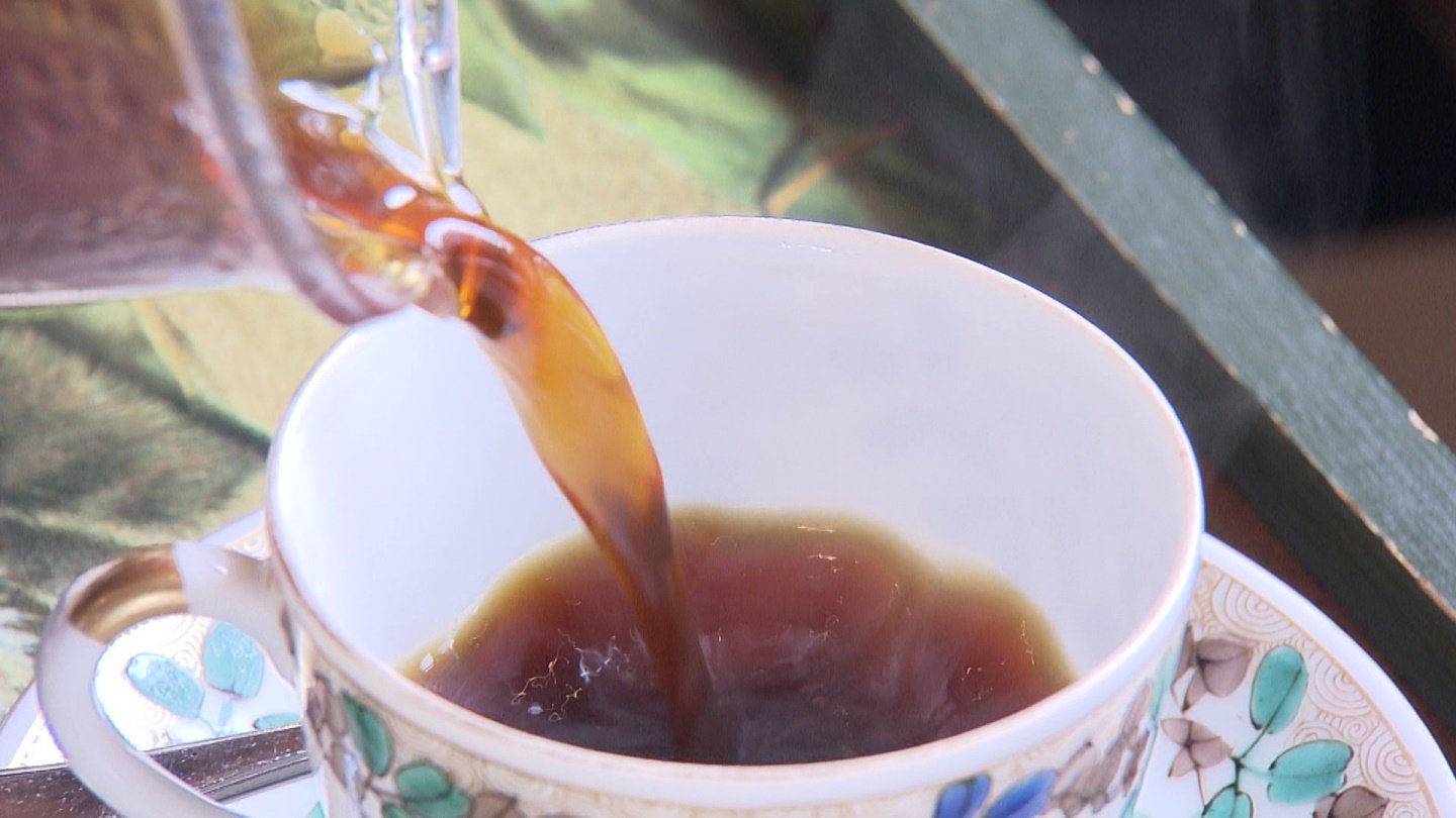 メニューは、アフタヌーンティー。約20種類が揃う世界各国の紅茶やコーヒーの本格的な味も評判。注文すると、ロングメイドの店員が目の前でコーヒーを淹れてくれる。