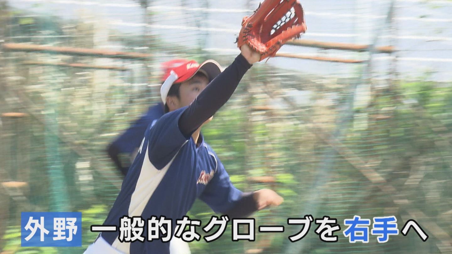 そして、外野では普通のグローブを右手につけ、捕球したら素早くグローブを外し右手で投げている。