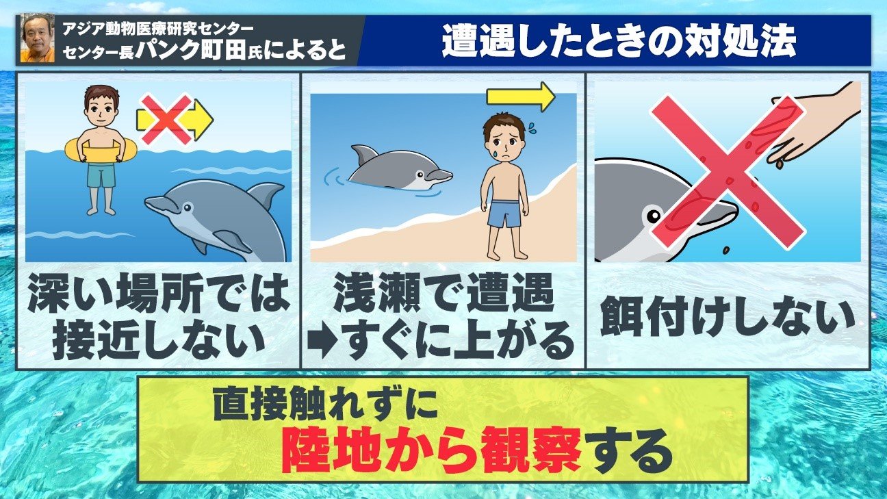 では野生のイルカに遭遇した場合どう対処すればいいのでしょうか。パンク町田氏によると、「深い場所では接近しない」「浅瀬で遭遇した場合はすぐに砂浜に上がる」「餌付けしない」「直接触れずに陸地から観察する」ことが重要だということです。