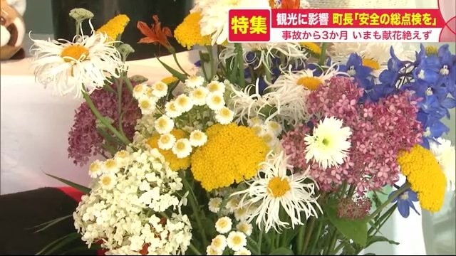 斜里町の役場には、いまも多くの献花やメッセージなどが置かれている。献花は週に40束ほどあり、職員が交代で1日2回、手入れをしている。