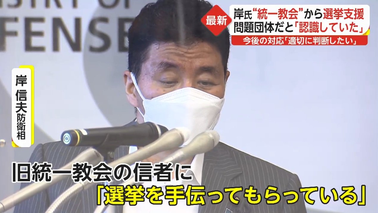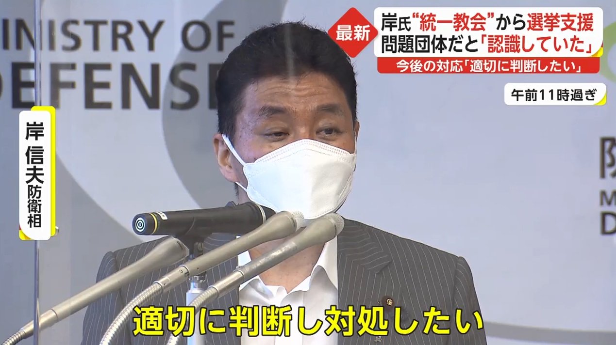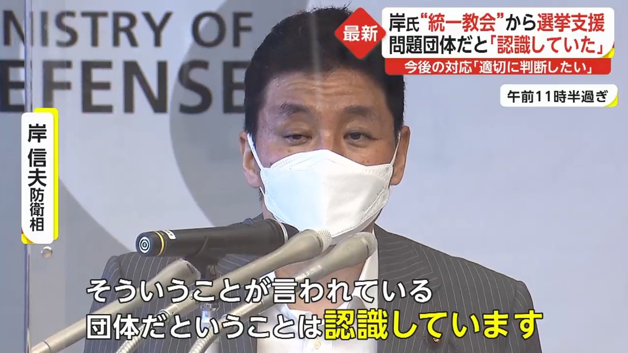 旧統一教会が霊感商法などで問題視された団体と認識していたことを明らかにした岸防衛相。その上で、今後も選挙で支援を受けるかについては明言しなかった。
