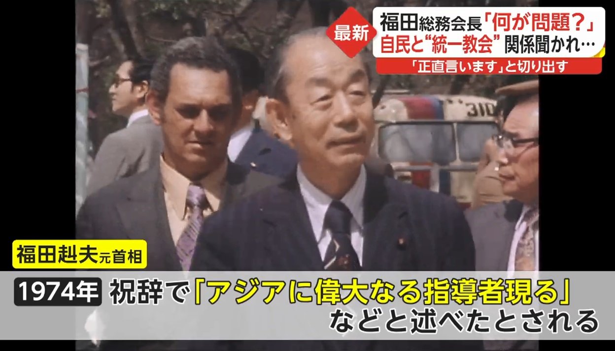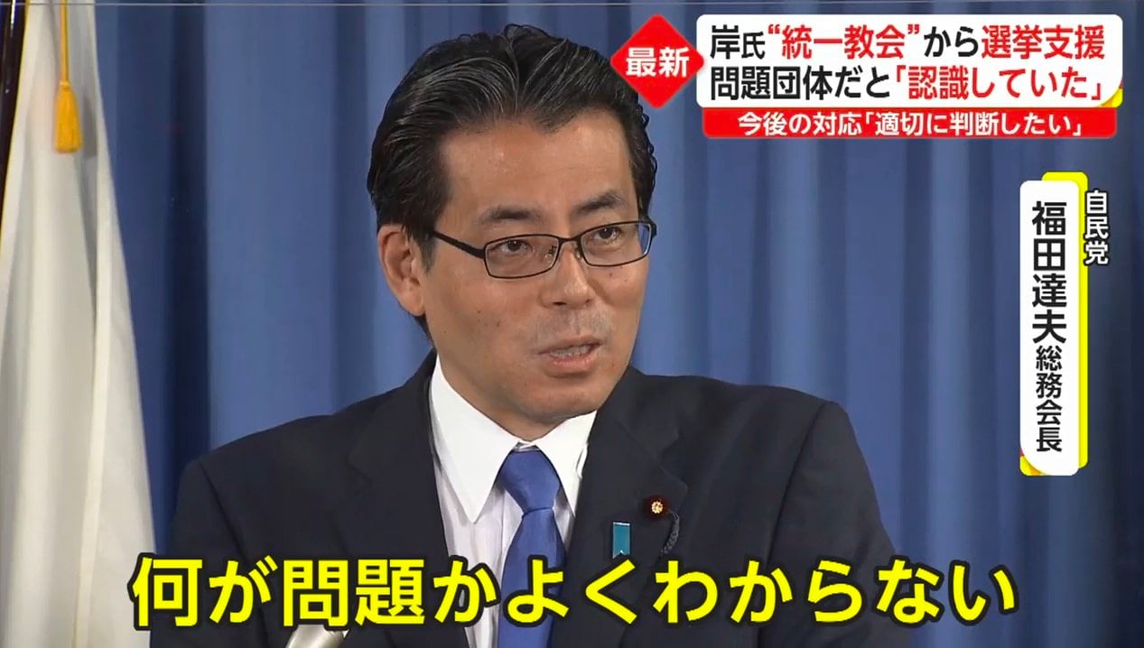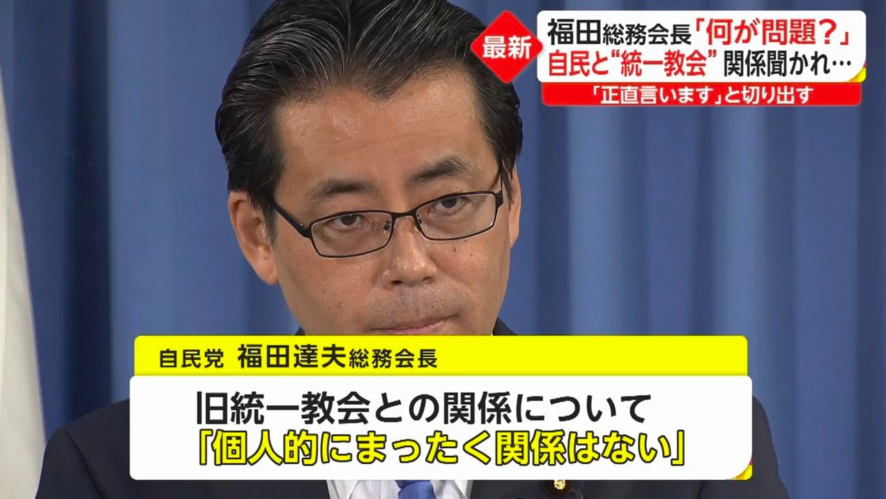 一方、孫の福田総務会長は、旧統一教会とは「個人的にまったく関係はない」と述べた。
