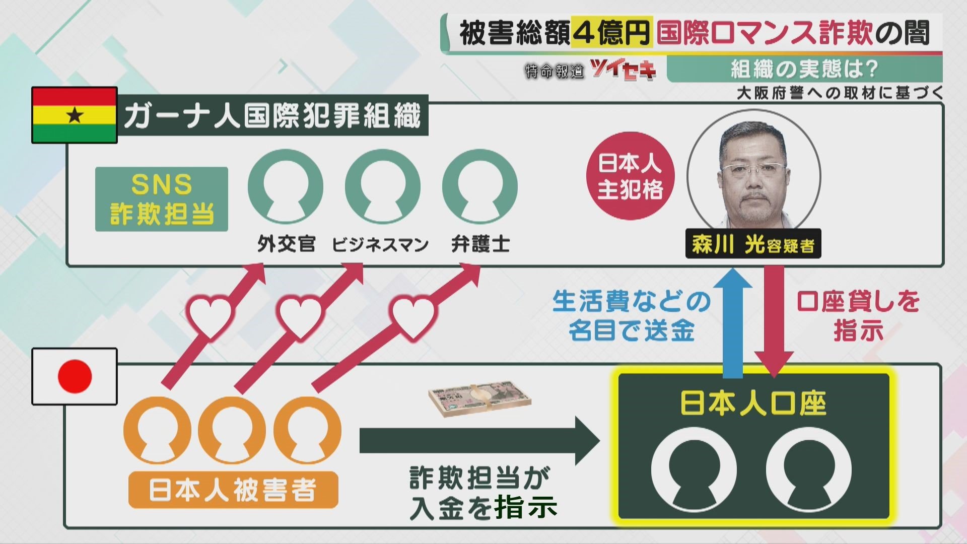 大阪府警によると、犯罪組織の本体があるのはアフリカ大陸にあるガーナ共和国。SNSを使って日本人に詐欺をしかける役割はガーナ人で、金銭をだまし取る際に登場するのが日本人名義の口座。Aさんが振り込んだ先もこの“日本人口座”だった。