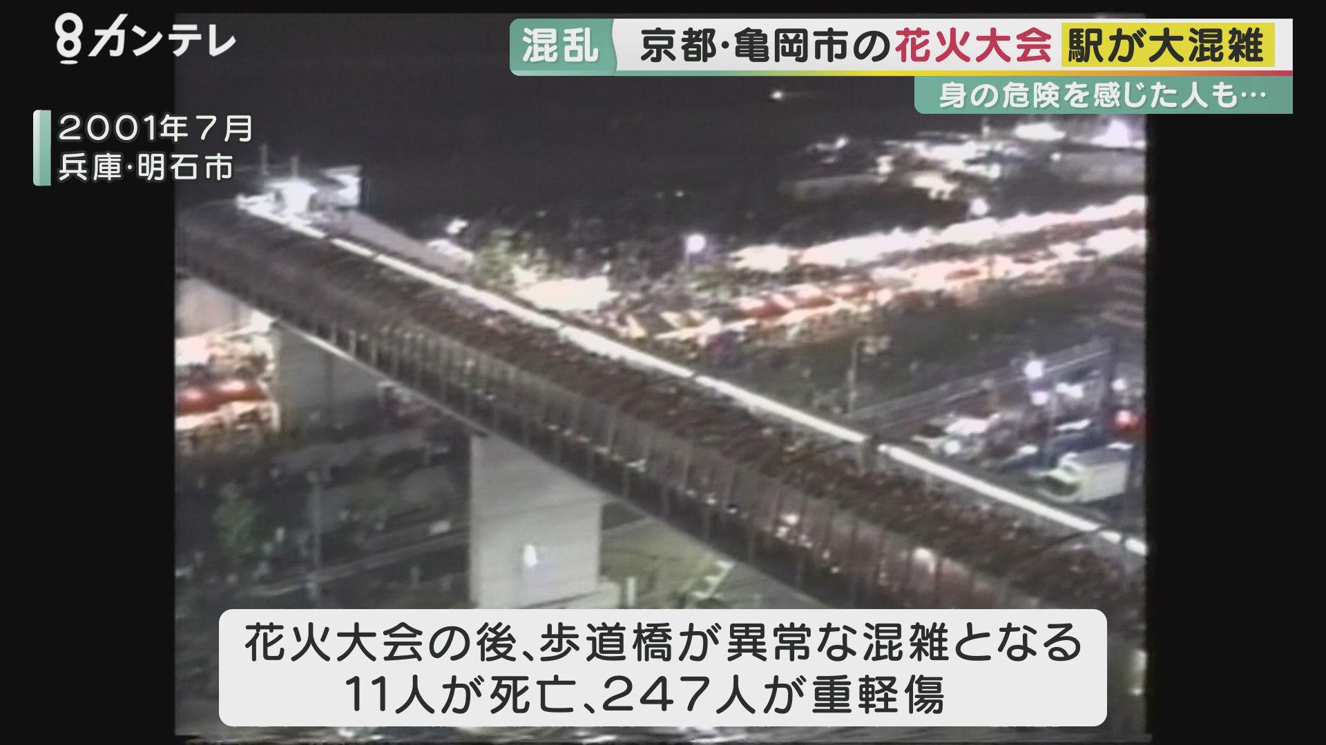 2001年、兵庫県明石市では花火大会の後、歩道橋が異常な混雑となり、転倒事故が起きて11人が死亡、247人が重軽傷を負った。