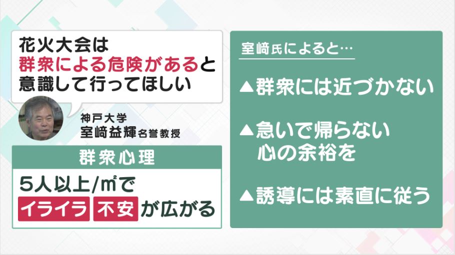 防災研究の第一人者・神戸大学の室崎名誉教授は、「花火大会は群衆による危険があると意識して行ってほしい」と話している。1平方メートル当たり5人以上が集まると、群集心理でイライラや不安が伝播(でんぱ)するそうだ。