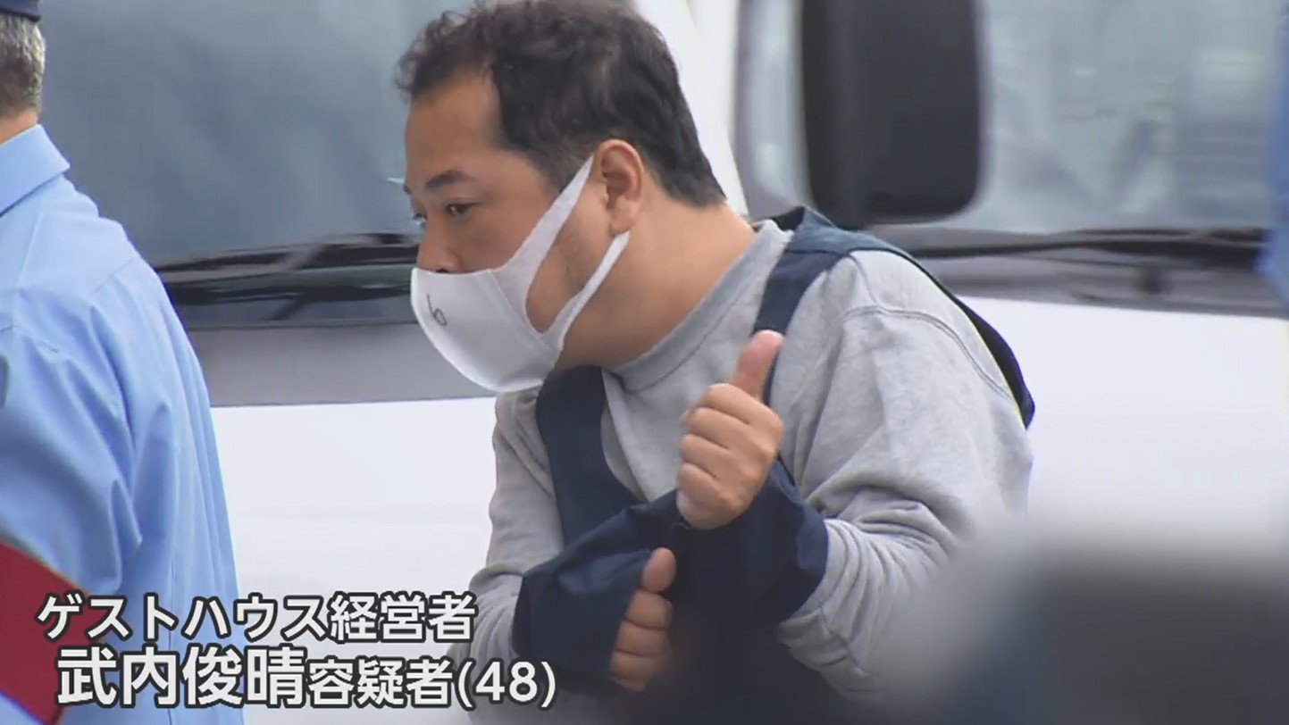 報道陣のカメラに親指を立てたのは、ゲストハウス経営者の武内俊晴容疑者(48)。女性客に性的暴行をした疑いで9月20日に逮捕された。