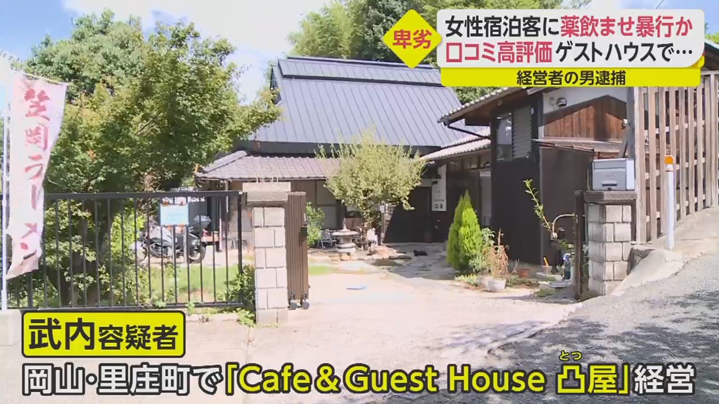 武内容疑者は、岡山県里庄町で「Cafe&Guest House 凸屋」を経営。