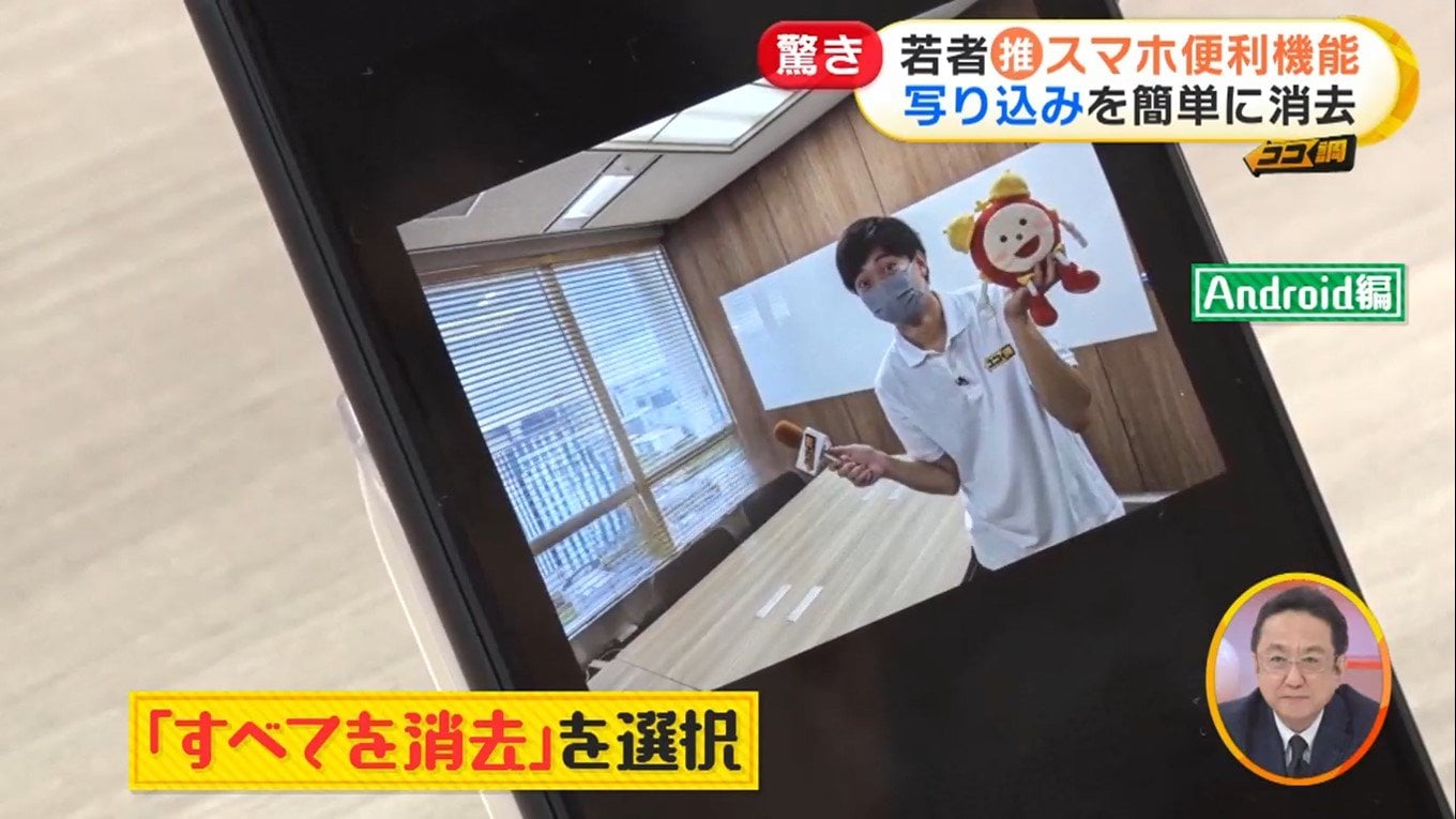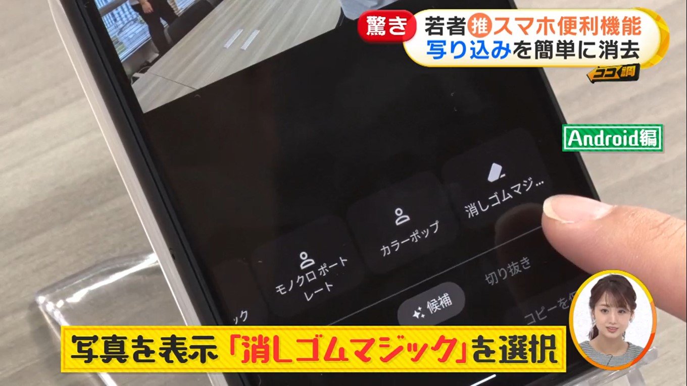 背景の人物が自動で白くなり、「すべてを消去」を選択すると…、写り込んだ人物やモノなどを簡単に消すことができる。