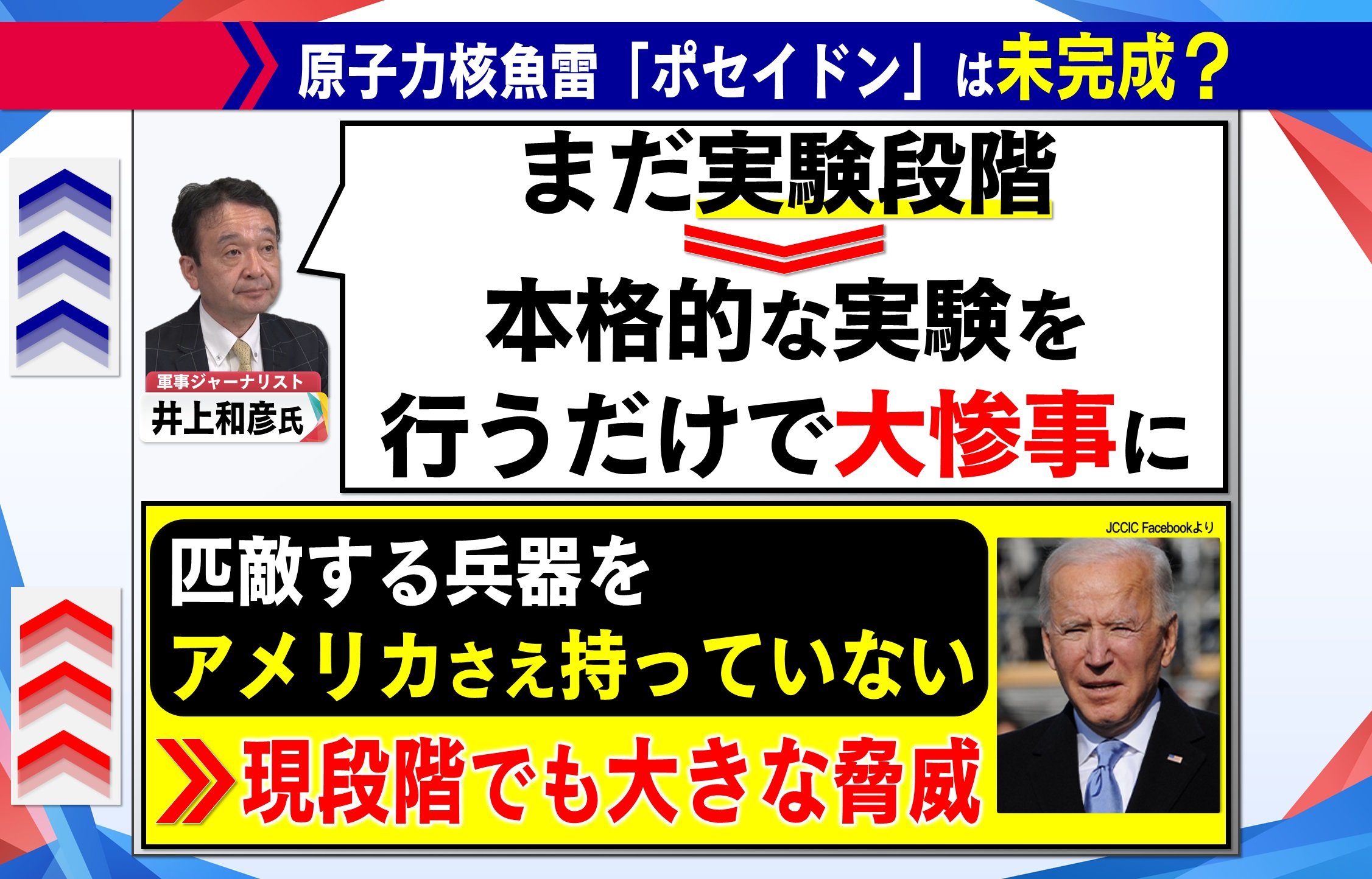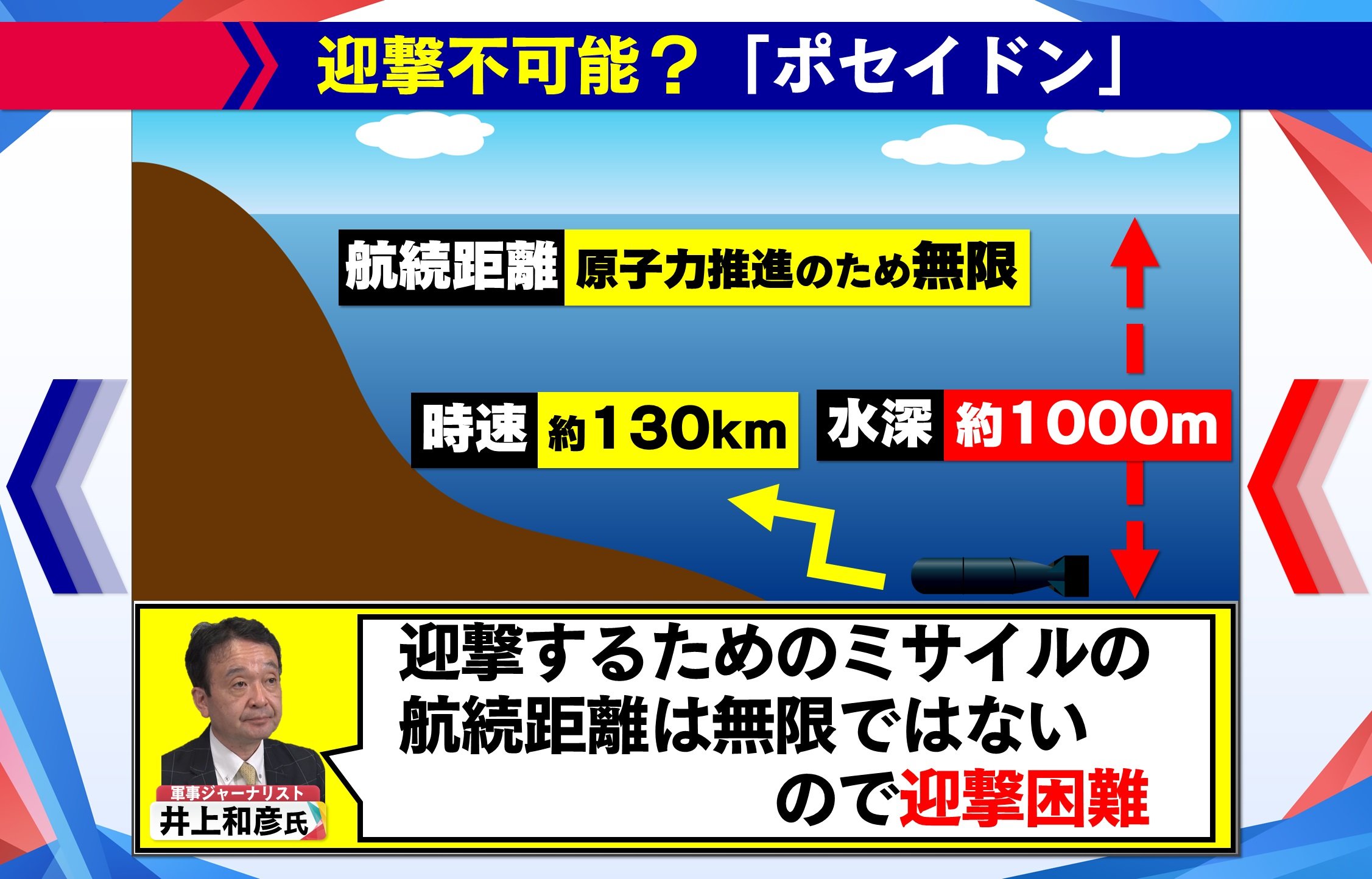 軍事ジャーナリストの井上和彦氏は、「ポセイドン」は水深1000mの深さを時速130kmで進み、原子力推進のため、ほぼ無限と言っても過言ではないほど長大な航続距離を有していることにふれ、射程が限られた通常のミサイルでは迎撃は困難と指摘します。