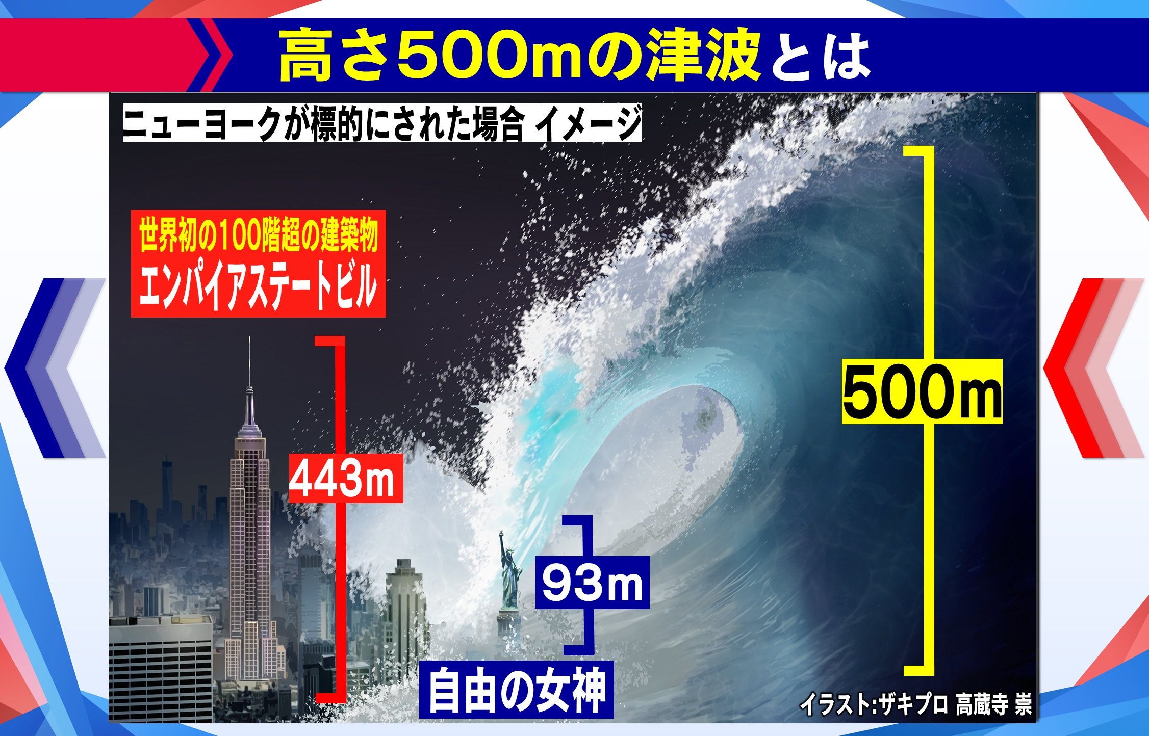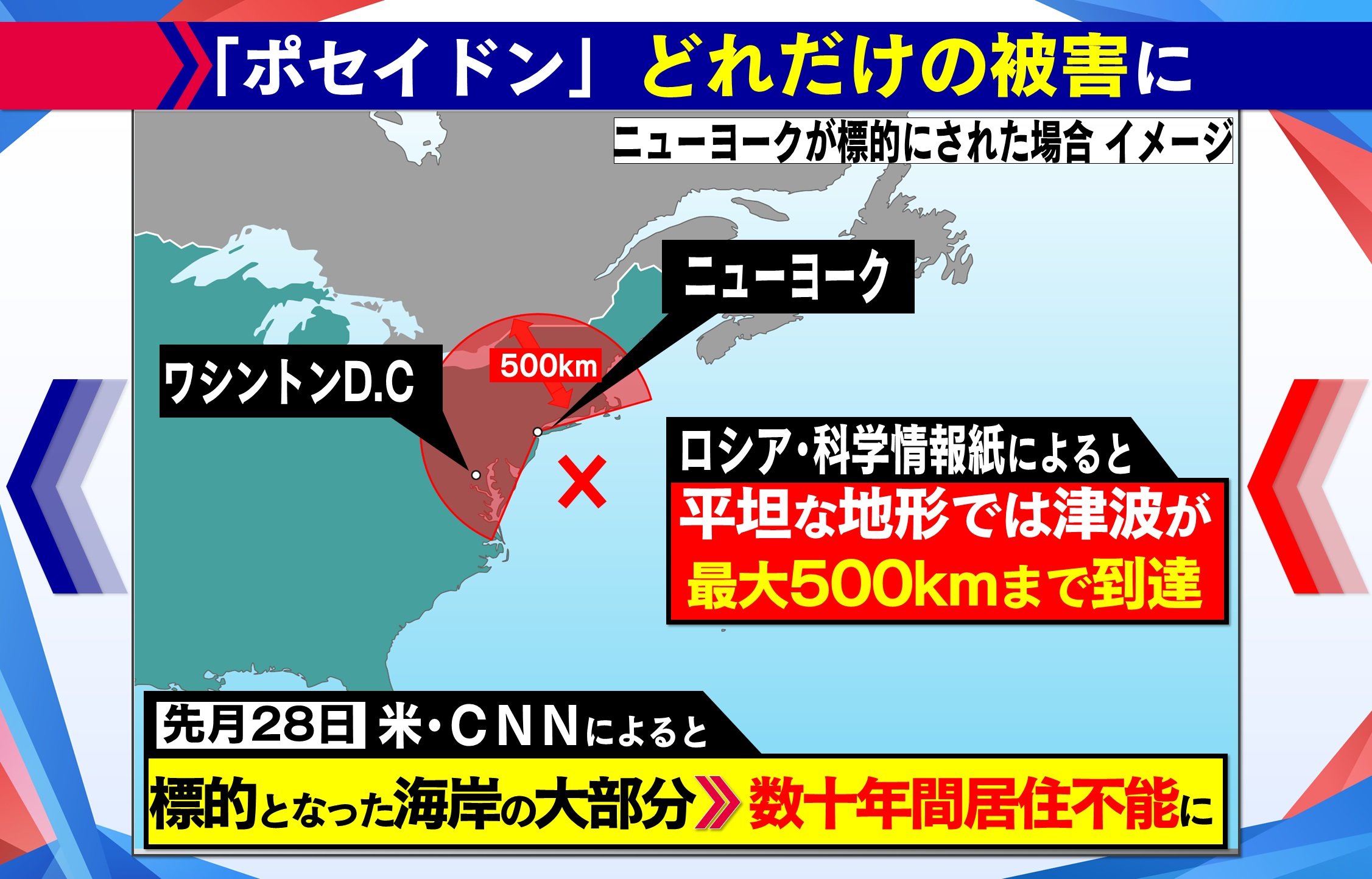 ロシア・科学情報誌によると、平坦な地形の場合、押し寄せた津波が内陸最大500kmの地点まで到達し、首都であるワシントンD.Cやさらにその先まで押し寄せるとも言われています。