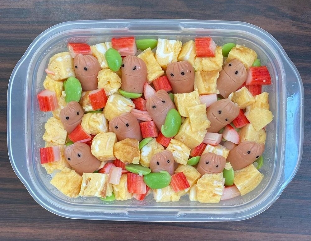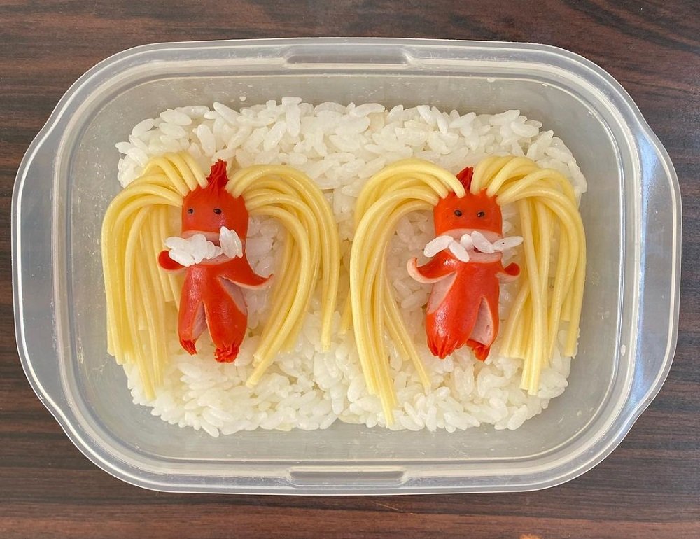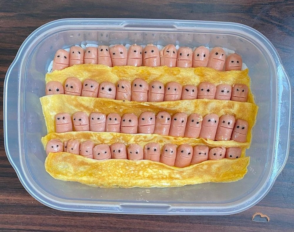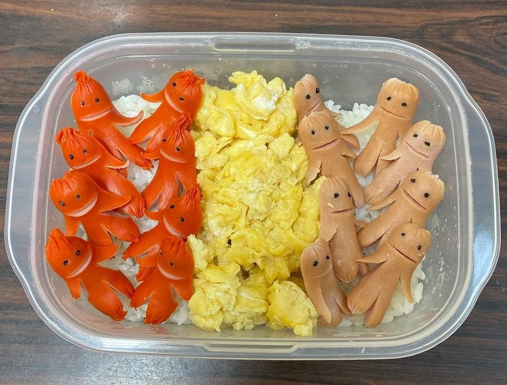 ある日に作られたのは、透明な容器の中に敷き詰められた白いごはんの上が3色で彩られている。真ん中は卵の黄色、そして左右を埋めるのは赤と茶色のウインナーだ。だが、そのウインナーたちには点々とした目に、横一文字の口。そして、手足まで確認できる。