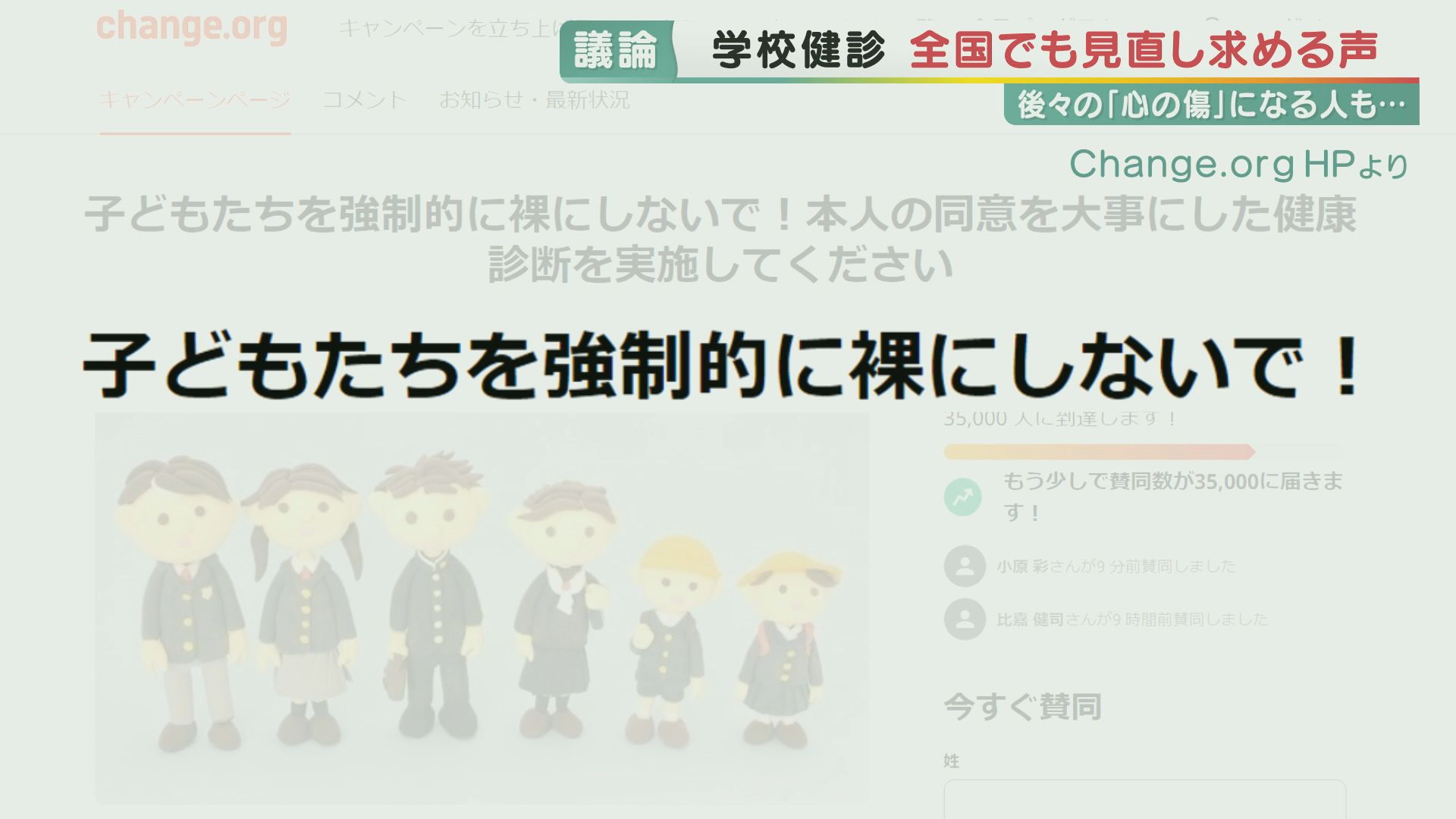 「子どもたちを強制的に裸にしないで!本人の同意を大事にしてほしい」と訴えるオンラインの署名サイトは、健診を受ける方法を子供本人の意思で決められるよう求めている。2年間で集まった署名は、2万6000を超えた。