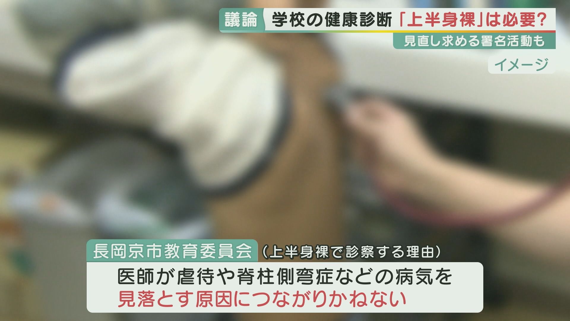 これについて長岡京市の教育委員会は、直前までバスタオルを羽織らせるなど年齢に応じた配慮は学校により行っているものの、上半身裸での診察は「必須」との立場を取る。