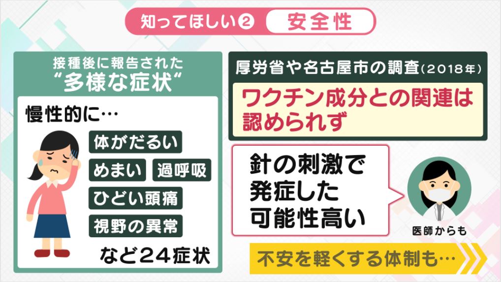 ただ、厚労省や名古屋市の調査では、ワクチン成分との関連性は認められないという結果となった。記者が取材した医師からも、思春期に打つワクチンなので、針の刺激で発症した可能性が高いのでは、という指摘があった。