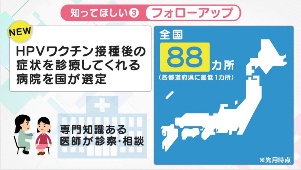 不安を軽減するため、国はHPVワクチン接種後の症状を診療してくれる病院を選定している。各都道府県に1つ以上、全国88カ所の協力医療機関を設置している。