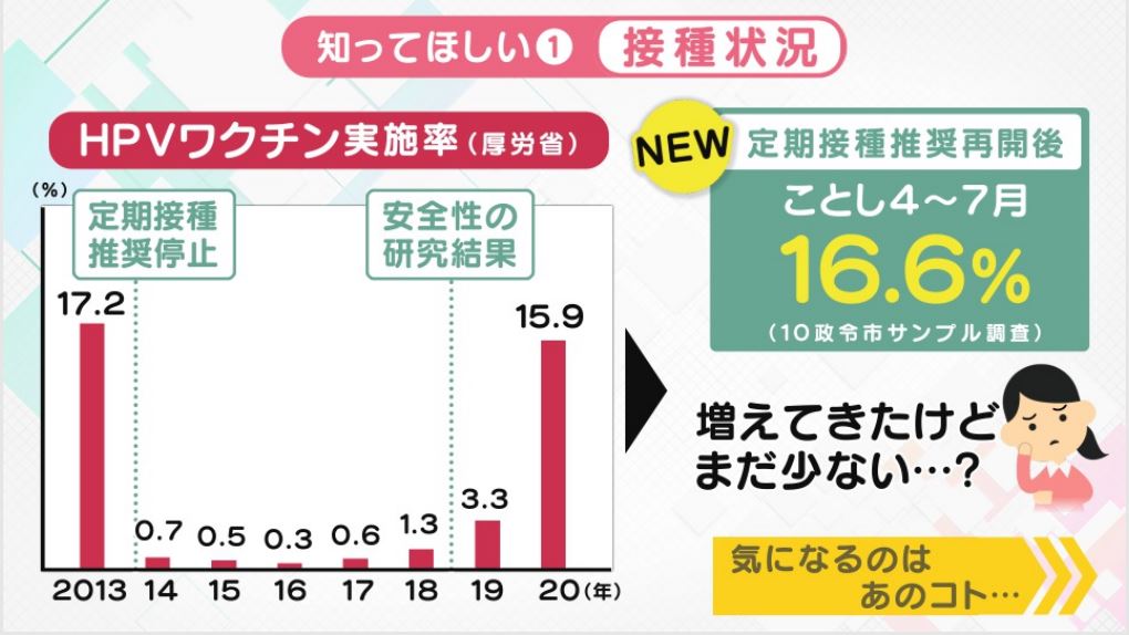 HPVワクチンは2013年度に定期接種になりましたが、体の痛みなどを訴える人が相次いだため、すぐに停止となりました。その後、ほぼ0%だった接種率は、安全性に特段の疑いが認められないという研究結果を受けて、2019年ごろから徐々に上昇。