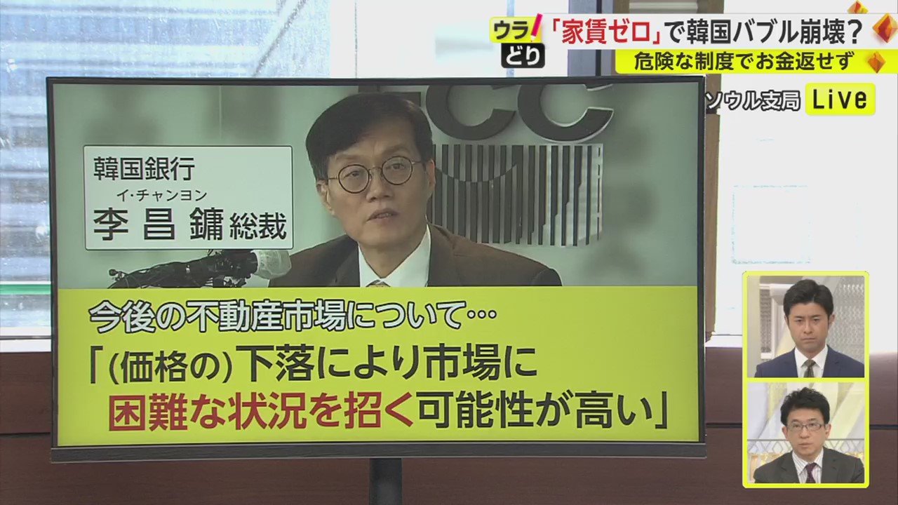 韓国銀行の李昌鏞(イ・チャンヨン)総裁は18日、今後の不動産市場について「(価格の)下落により、市場に困難な状況を招く可能性が高い」と発言していて、このままいくと韓国経済全体を脅かしかねない状況だ。