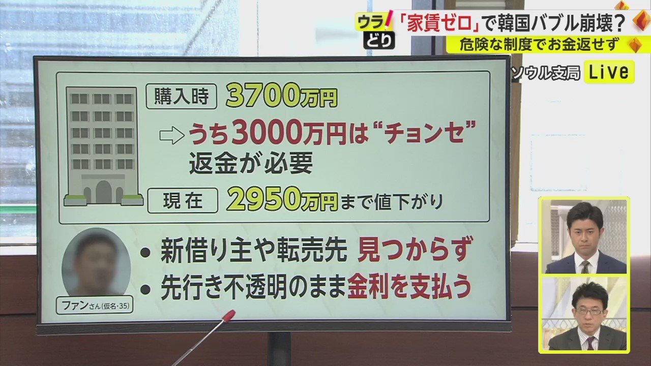 ファンさんが購入した住宅の1つは3700万円だったが、そのうち3000万円は、借主から預かった「チョンセ」の保証金だ。契約の満了に伴い全額を返金しなければいけないのに、物件価格は今2950万円まで下がり、保証金にも足りていない。新たな借主も、転売先も見つからず、まさに先が見えないまま金利を払い続けている状況だ。