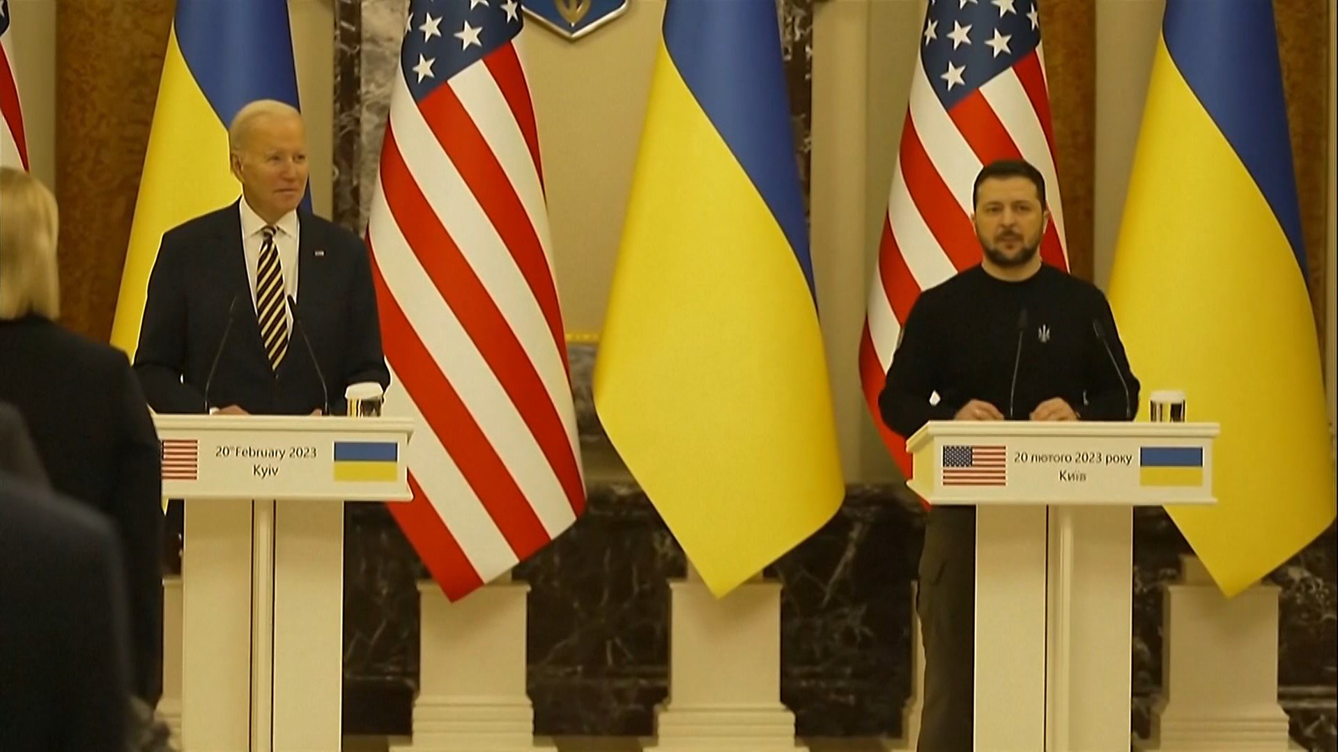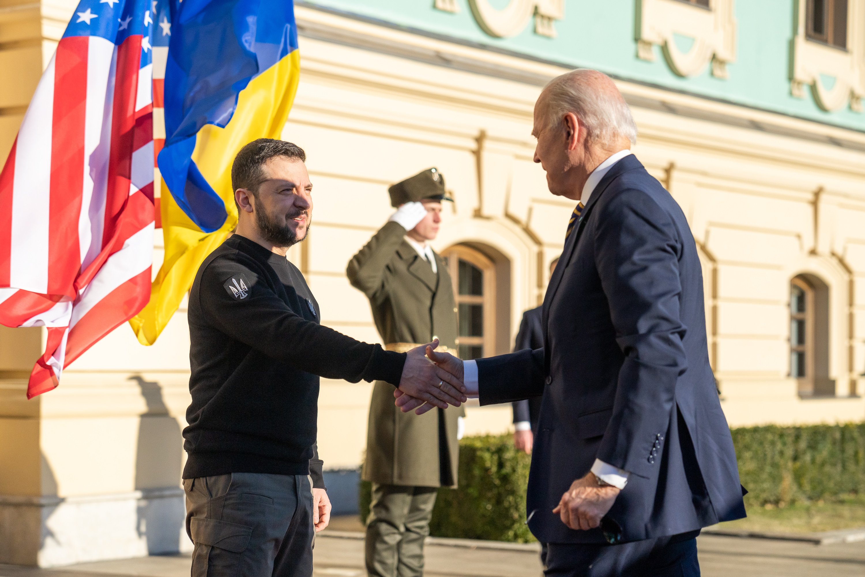 午前8時半(日本時間午後3時半)にはバイデン大統領はゼレンスキー大統領が待つ大統領府に到着。バイデン氏は青いスーツに、ウクライナカラーである青と黄色のストライプのネクタイを身に着つけていた。ゼレンスキー大統領はバイデン大統領の手を握りしめ「訪問頂きありがとうございます」と出迎え、バイデン大統領はゼレンスキー氏の子ども達のことなどを気遣いながら「お会いできて驚いています」と話した。