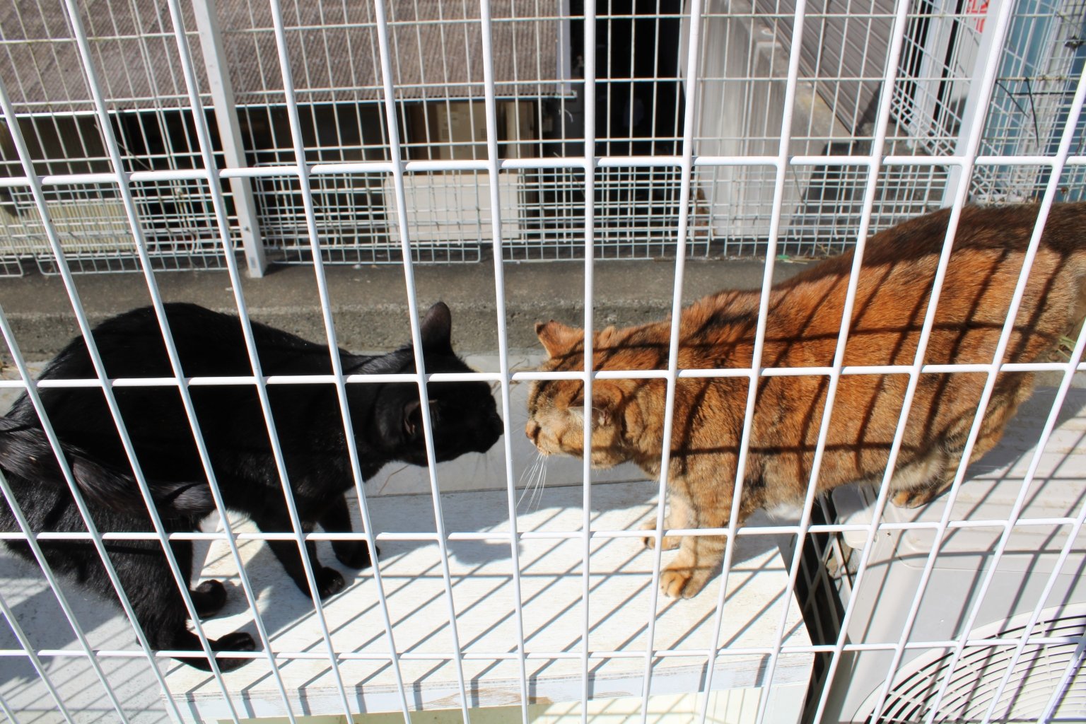 ネコは4匹。普段は白い大きなおりの中で暮らしている。保護したネコもいれば、自然と住み着いたネコも。